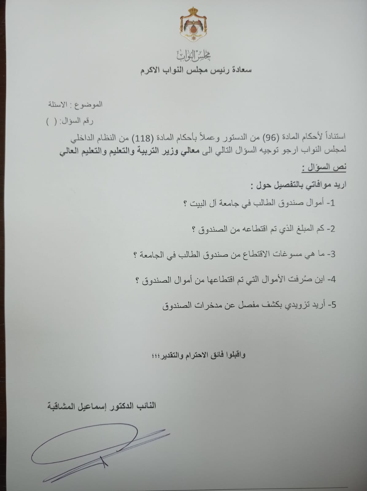 وجّه النائب الدكتور إسماعيل المشاقبة سؤالاً نيابياً إلى وزير التربية والتعليم والتعليم العالي، استناداً لأحكام الدستور والنظام الداخلي لمجلس النواب، طالب فيه بتوضيحات مفصلة حول صندوق الطالب في جامعة آل البيت.