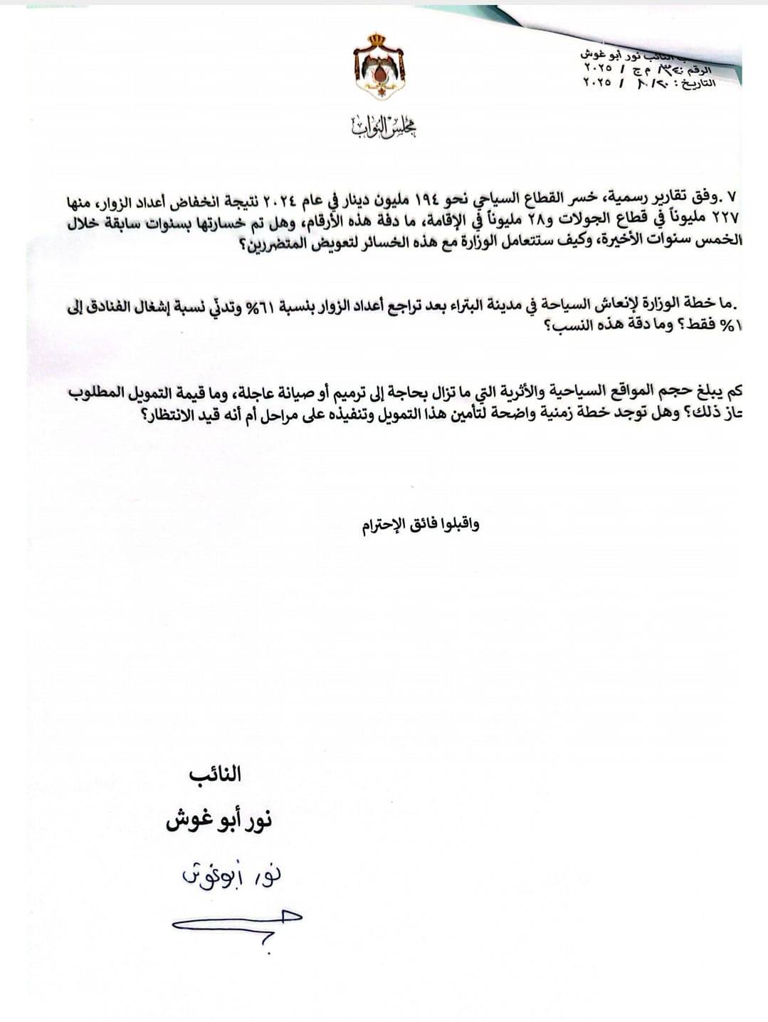 وجّهت النائب نور أبو غوش سؤالاً نيابياً إلى وزير السياحة والآثار، استنادًا لأحكام الدستور والنظام الداخلي لمجلس النواب، طالب فيه بتوضيح الإجراءات التي تتخذها الوزارة لتعويض النقص في أعداد السياح، سواء عبر دعم السياحة الداخلية أو استقطاب سياحة خارجية.