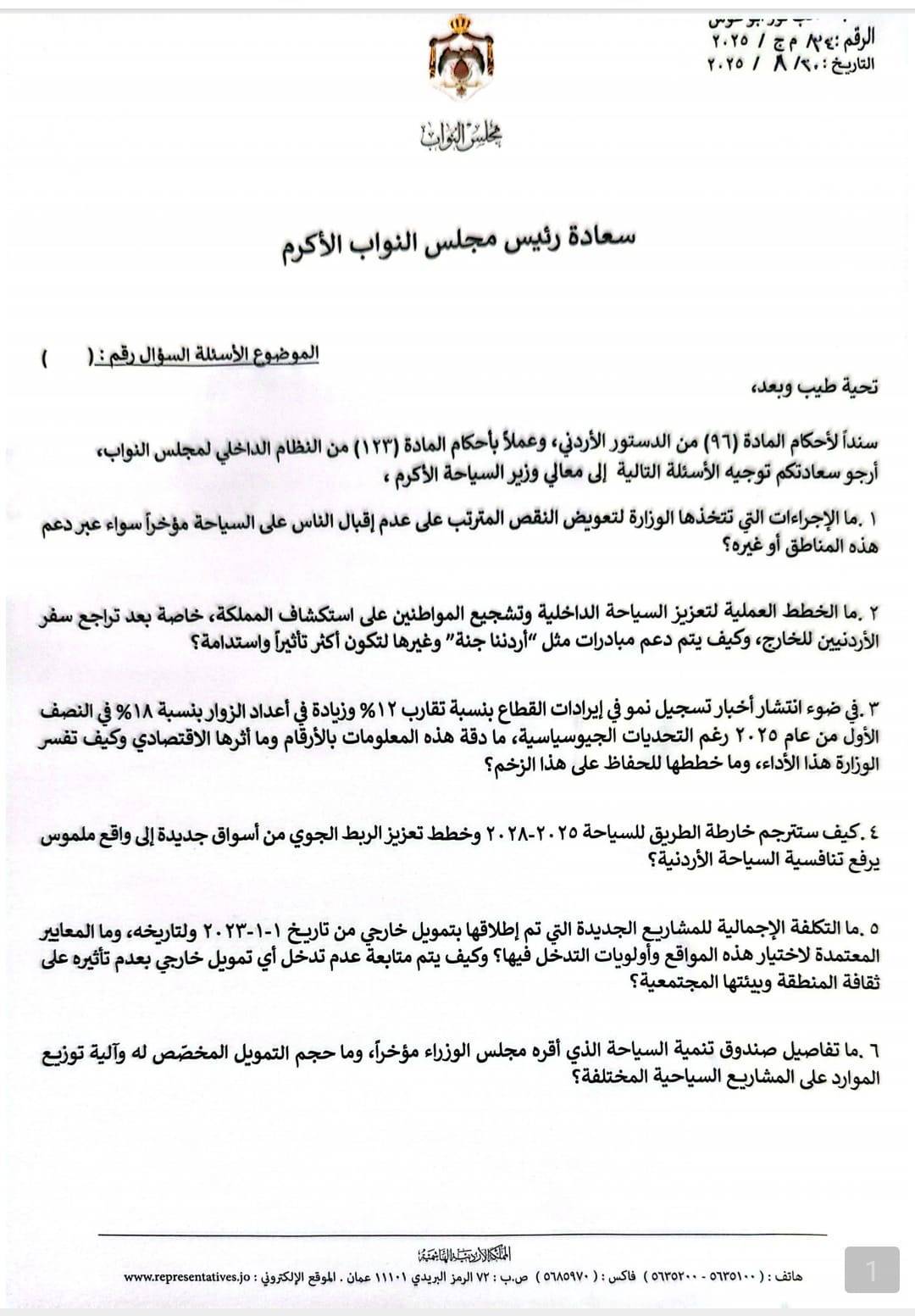 كما استفسرت عن تفاصيل خارطة الطريق للسياحة 2025 – 2028، وخطط تعزيز الربط الجوي مع أسواق جديدة بما يرفع تنافسية السياحة الأردنية، إلى جانب حجم التمويل الخارجي الذي أُطلق للمشاريع السياحية منذ عام 2022، وآلية متابعته وتوزيعه على مختلف المشاريع.
