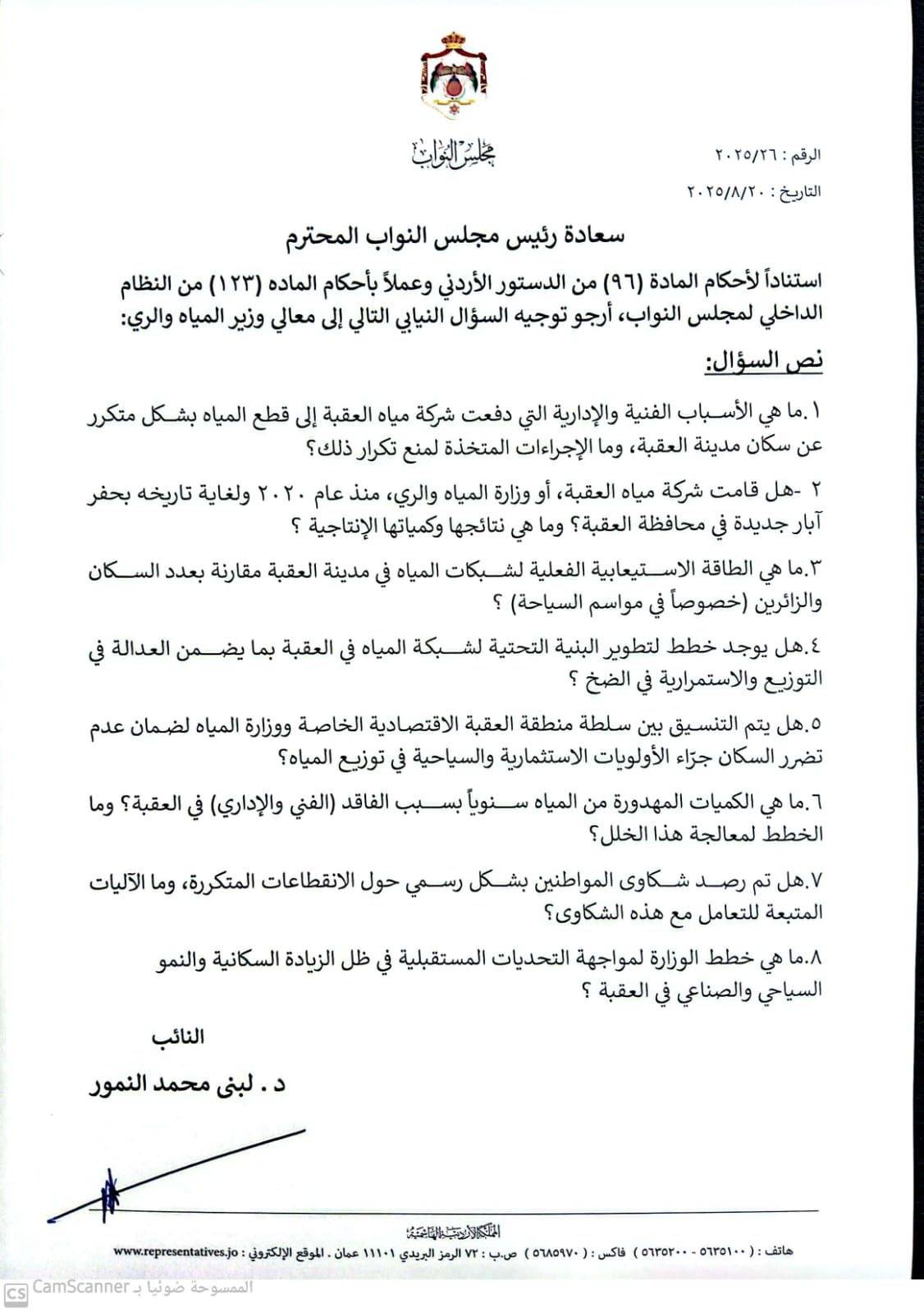 استناداً لأحكام المادة (96) من الدستور الأردني وعملاً بأحكام الماده (123) من النظام الداخلي لمجلس النواب، أرجو توجيه السؤال النيابي التالي إلى معالي وزير المياه والري: