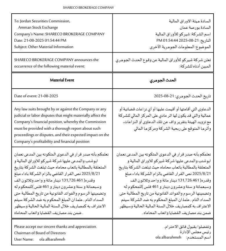 أعلنت شركة شيركو للأوراق المالية عن صدور قرار في الدعوى القضائية المقامة ضدها من المدعي عثمان أبوشنار، حيث تضمن القرار الحكم بمبلغ قدره 131,726 دينارًا بالإضافة إلى 461 دينارًا أتعاب محاماة مع الرسوم والمصاريف.