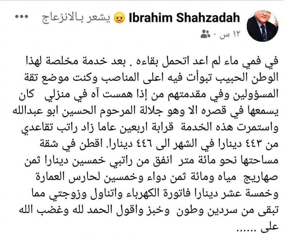 وقال شاهزاده في منشوره ، ” في فمي ماء ، لم اعد اتحمل بقاءه” ، وقال ، ” إن راتبه التقاعدي ارتفع من 443 الى 446 دينارا فقط بعد خدمة 40 عاما في الاعلام الحكومي .