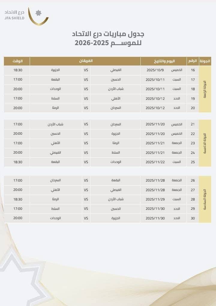 أصدر الاتحاد الأردني لكرة القدم، جدول مباريات بطولة درع الاتحاد لموسم 2025/2026، والتي تنطلق الخميس 28 آب الجاري، بمشاركة أندية المحترفين، وتقام جميع المواجهات على ستاد الأمير محمد.