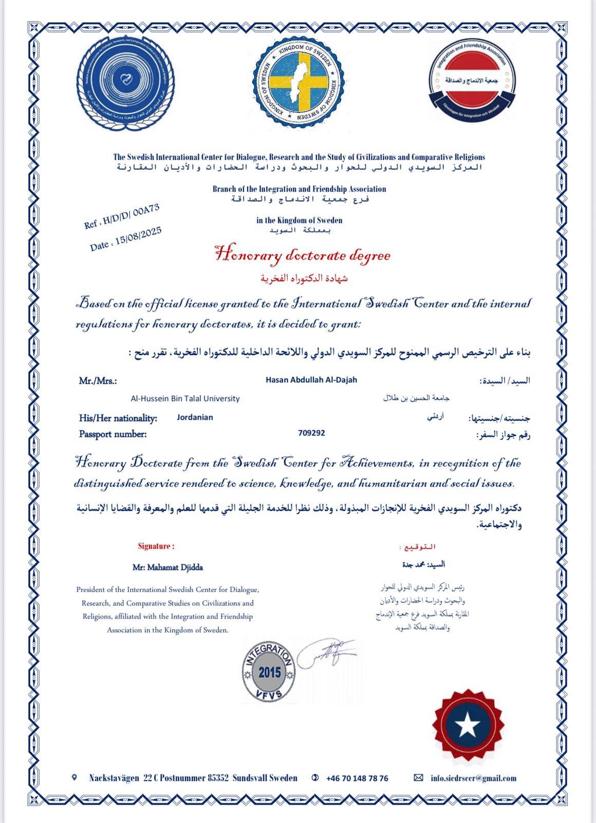 البروفيسور حسن عبدالله الدعجة يتسلّم الدكتوراه الفخرية من المركز السويدي الدولي للحوار والبحوث