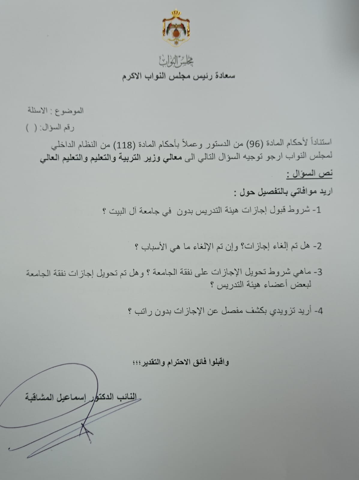 قدّم النائب الدكتور إسماعيل المشاقبة سؤالاً نيابياً إلى وزير التربية والتعليم والتعليم العالي، طالب فيه بإجابات مفصلة وموثقة حول ملف الإجازات الممنوحة لأعضاء هيئة التدريس في جامعة آل البيت، وما يثار حولها من إلغاء أو تحويل على نفقة الجامعة.