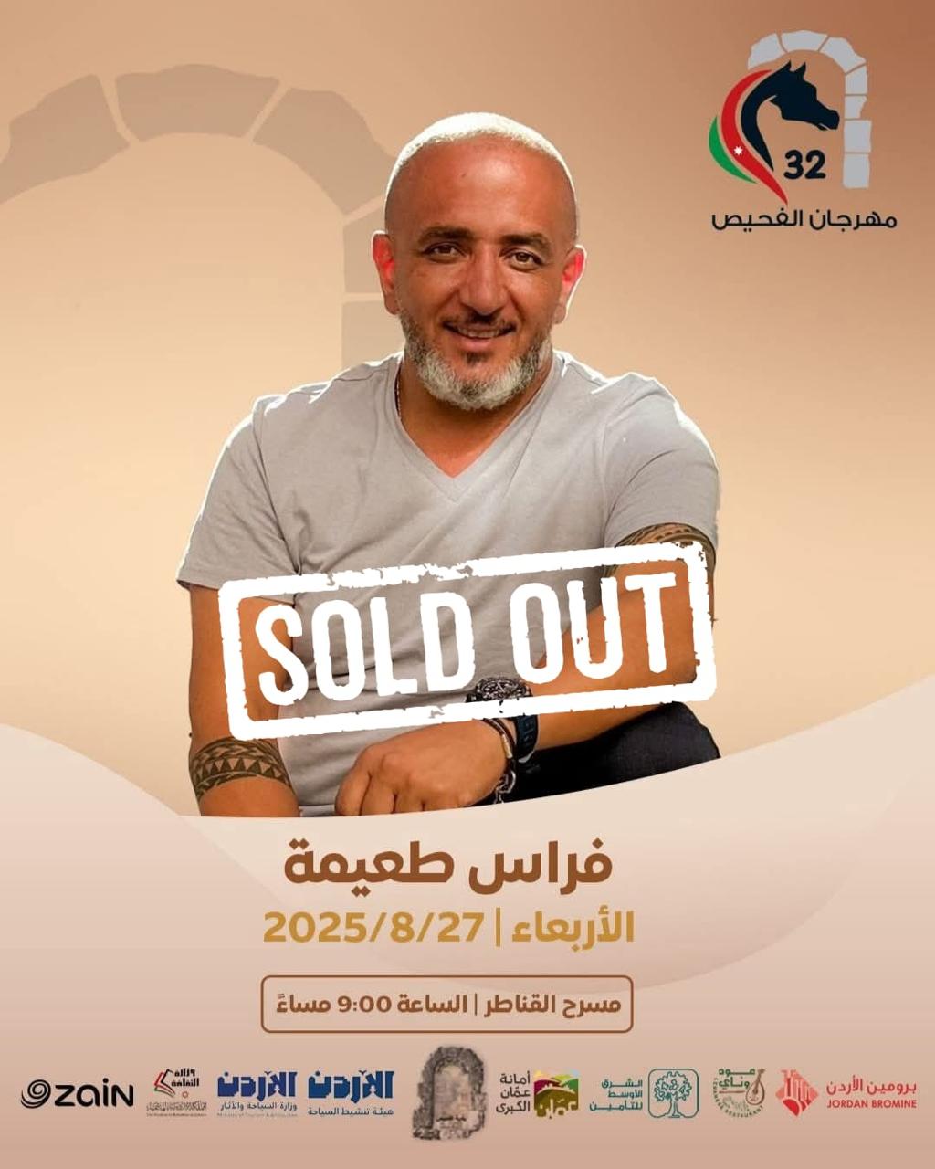 بعد غياب طويل ، يعود الفنان فراس طعيمة باطلالة مرتقبة ضمن فعاليات مهرجان الفحيص في دورته الـ32 ، وتمثل عودة هذا الفنان قيمة كبيرة لدى جمهور الأغنية، الذي يرتبط بعلاقة وثيقة مع روائعه الغنائية ، ويعيدنا إلى زمن الطرب والفن الأصيل،ليعيش الجمهور ليلة استثنائية سيذكرها متذوقي الطرب والأغنية الأصلية .