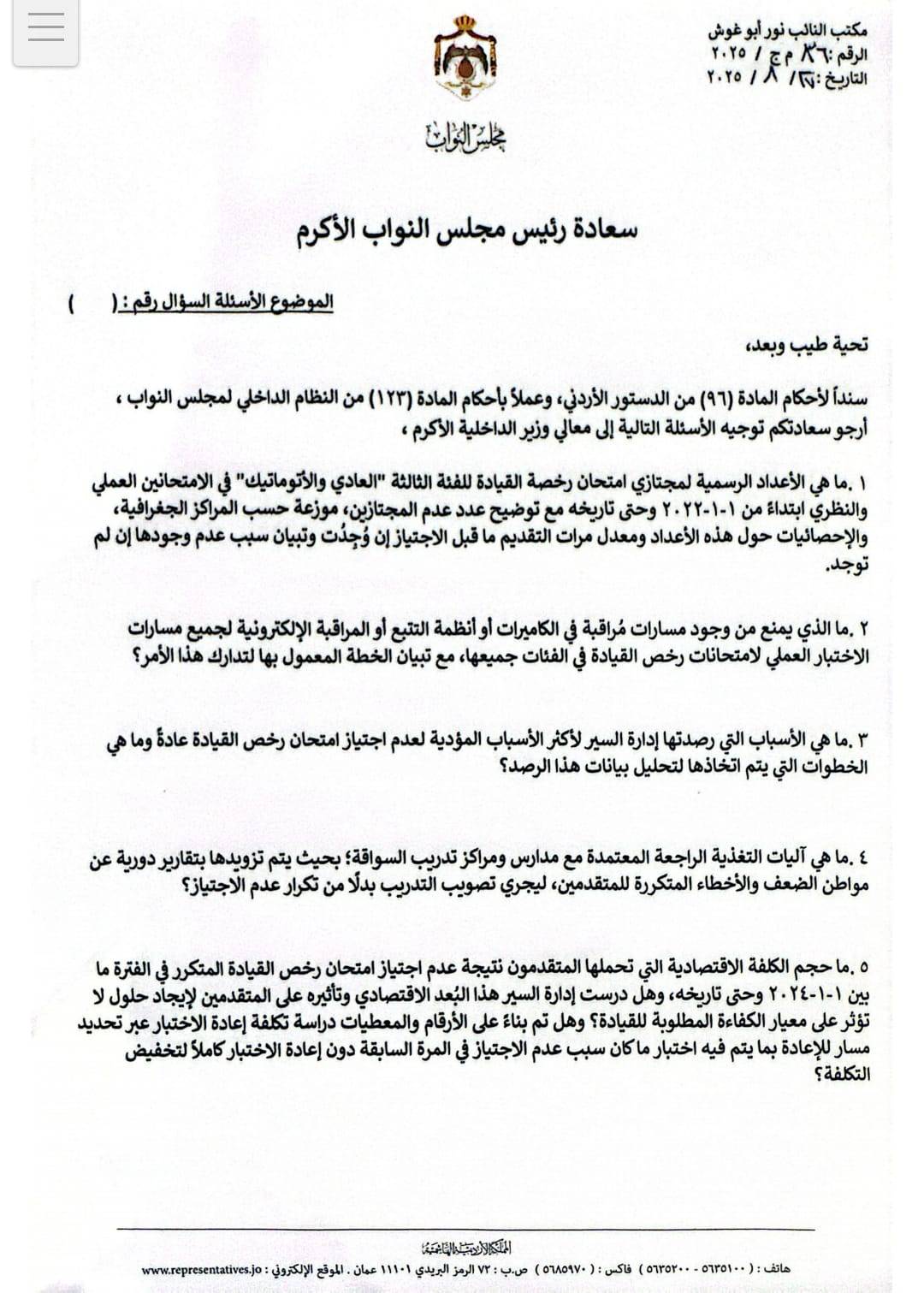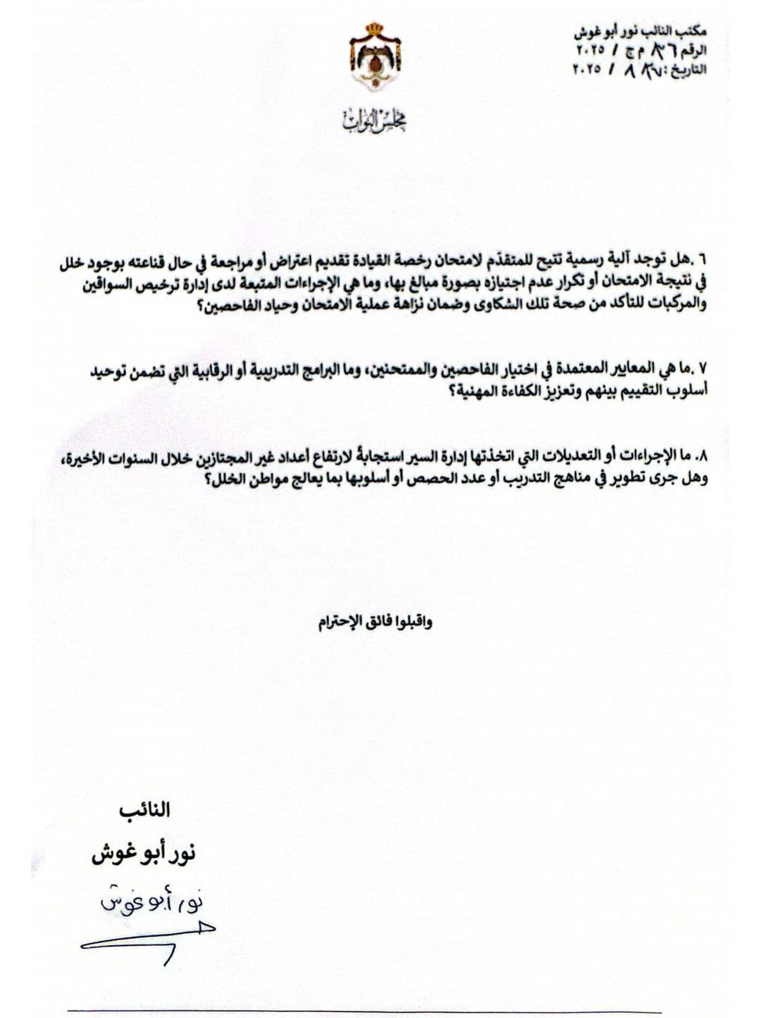 احمد قدورة - وجّهت النائب نور أبو غوش كتابًا رسميًا إلى رئيس مجلس النواب لتوجيه مجموعة من الأسئلة إلى وزير الداخلية بخصوص امتحانات رخص القيادة في الأردن، وذلك استنادًا لأحكام المادة (96) من الدستور وأحكام المادة (123) من النظام الداخلي لمجلس النواب.