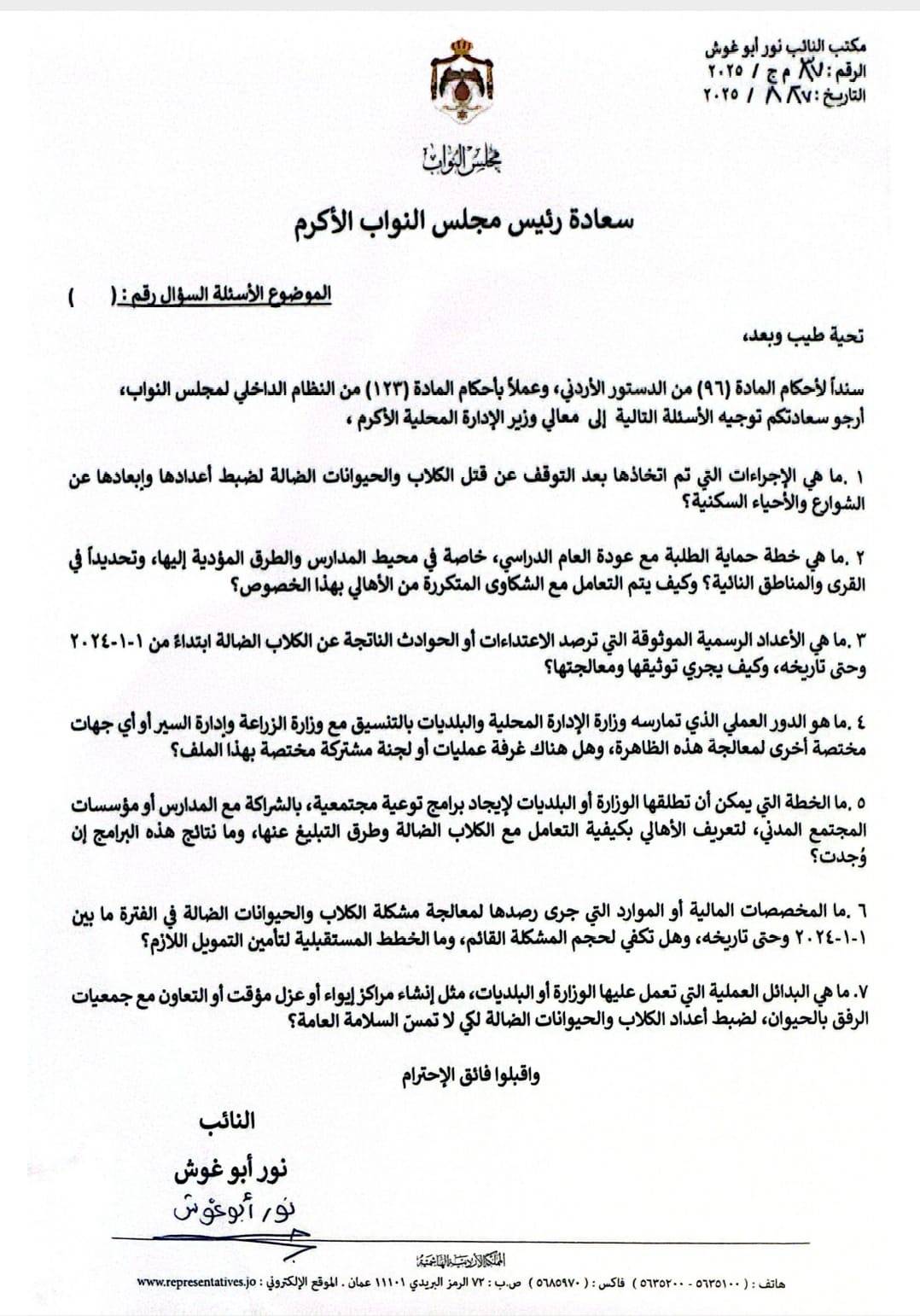٦. ما المخصصات المالية أو الموارد التي جرى رصدها لمعالجة مشكلة الكلاب والحيوانات الضالة في الفترة ما بين ١-١-٢٠٢٤ وحتى تاريخه، وهل تكفي لحجم المشكلة القائم، وما الخطط المستقبلية لتأمين التمويل اللازم؟