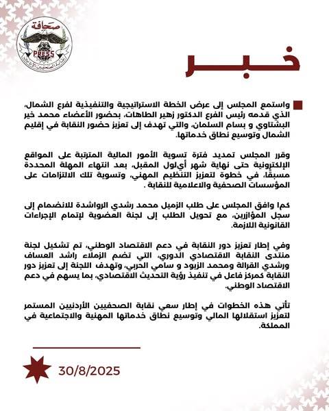 واستمع المجلس إلى عرض الخطة الاستراتيجية والتنفيذية لفرع الشمال، الذي قدمه رئيس الفرع الدكتور زهير الطاهات، بحضور الأعضاء محمد خير البشتاوي و بسام السلمان، والتي تهدف إلى تعزيز حضور النقابة في إقليم الشمال وتوسيع نطاق خدماتها.
