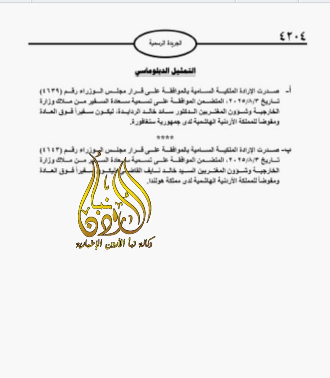 وصدرت الإرادة الملكية السامية كذلك، وحسب ما جاء في الجريدة الرسمية، بالموافقة على قرار مجلس الوزراء المتضمن الموافقة على تسمية السفير من ملاك وزارة الخارجية الدكتور سائد الردايدة، ليكون سفيراً فوق العادة ومفوضا للمملكة الأردنية الهاشمية لدى جمهورية سنغافورة.