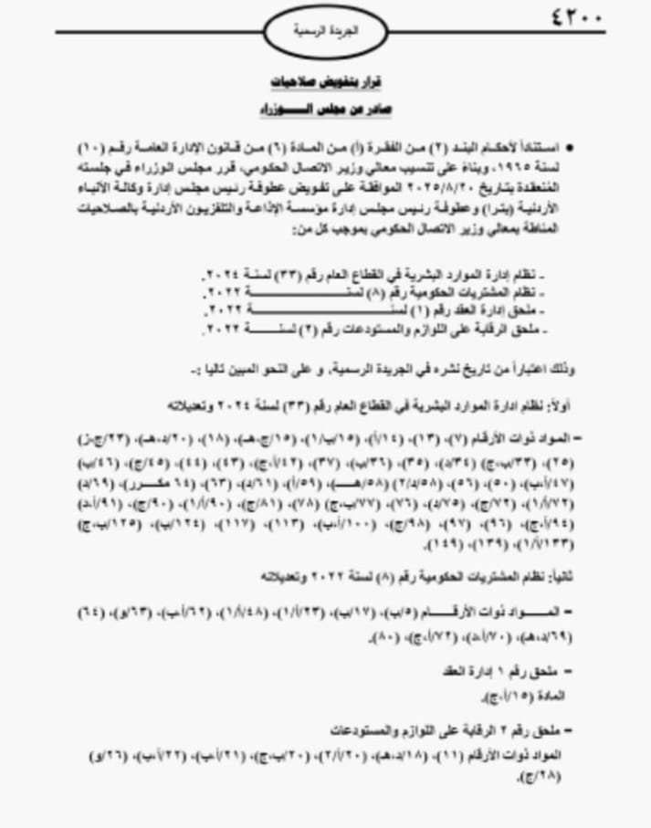 قرر مجلس الوزراء في جلسته المنعقدة بتاريخ ٢٠٢٥/٨/٢٠ الموافقة على تفويض رئيس مجلس إدارة وكالة الأنباء الأردنية (بترا)، ورئيس مجلس إدارة مؤسسة الإذاعة والتلفزيون الأردنية بالصلاحيات المناطة بوزير الاتصال الحكومي استناداً لأحكام قانون الإدارة العامة رقم (١٠) لسنة ١٩٦٥ ، وبناءً على تنسيب وزير الاتصال الحكومي.