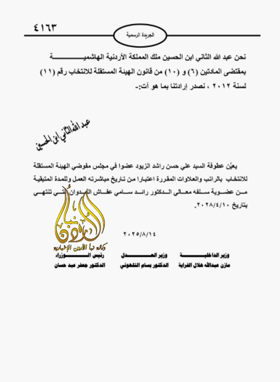 صدرت الإرادة الملكية السامية اليوم السبت بتعيين عطوفة السيد علي حسن راشد الزيود عضوا في مجلس مفوضية الهيئة المستقلة للانتخاب بالراتب والعلاوات المقررة اعتبارا من تاريخ مباشرته العمل وللمدة المتبقة من عضوية سلفه معالي الدكتور رائد سلمي عفاش العدوان التي تنتهي بتاريخ10-4-2028.
