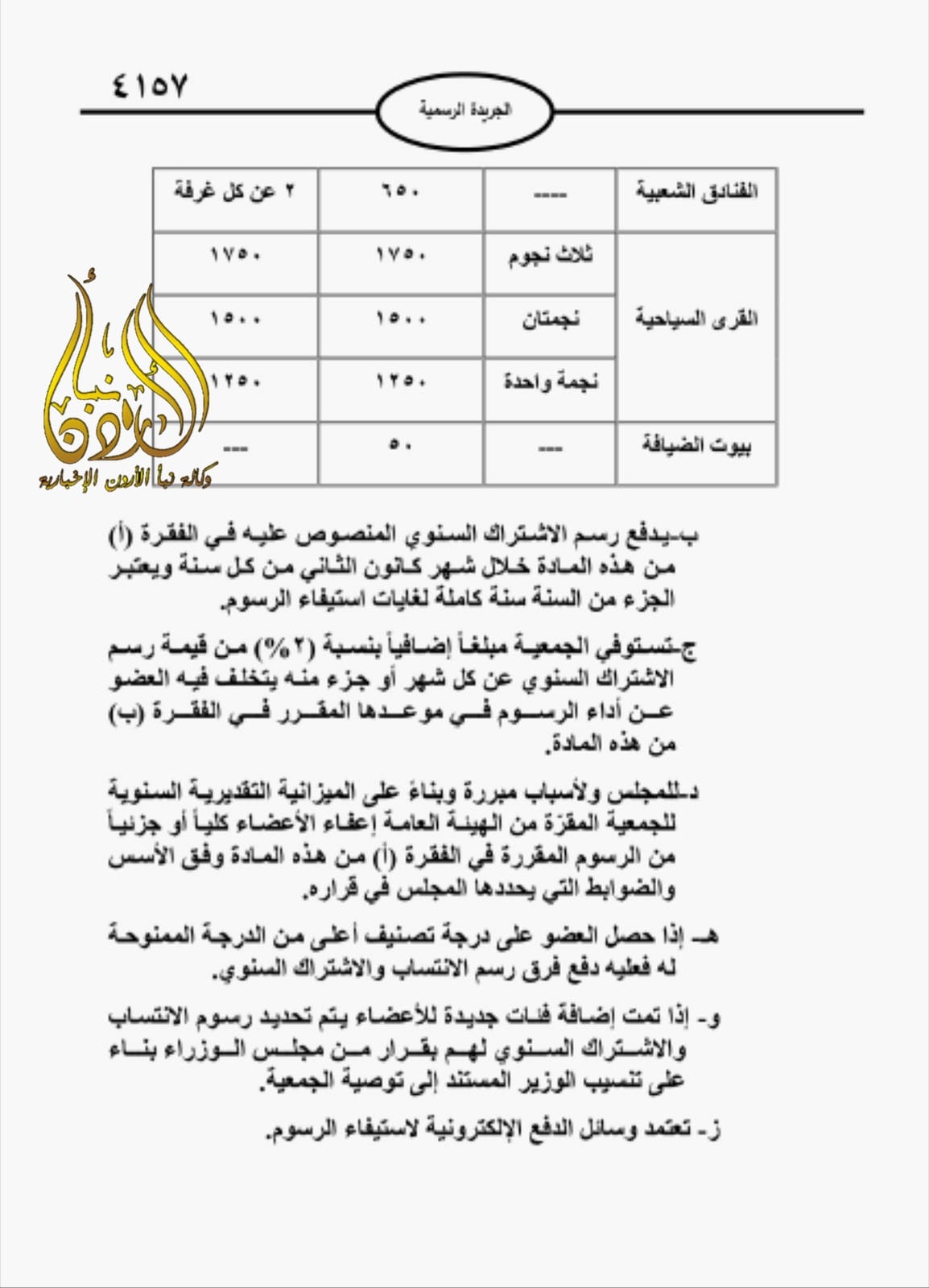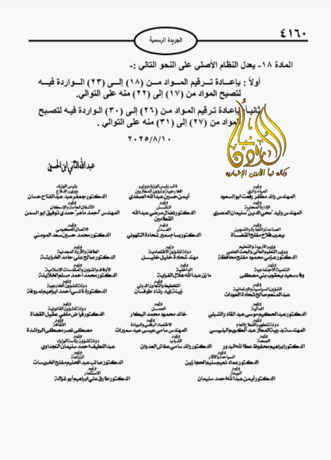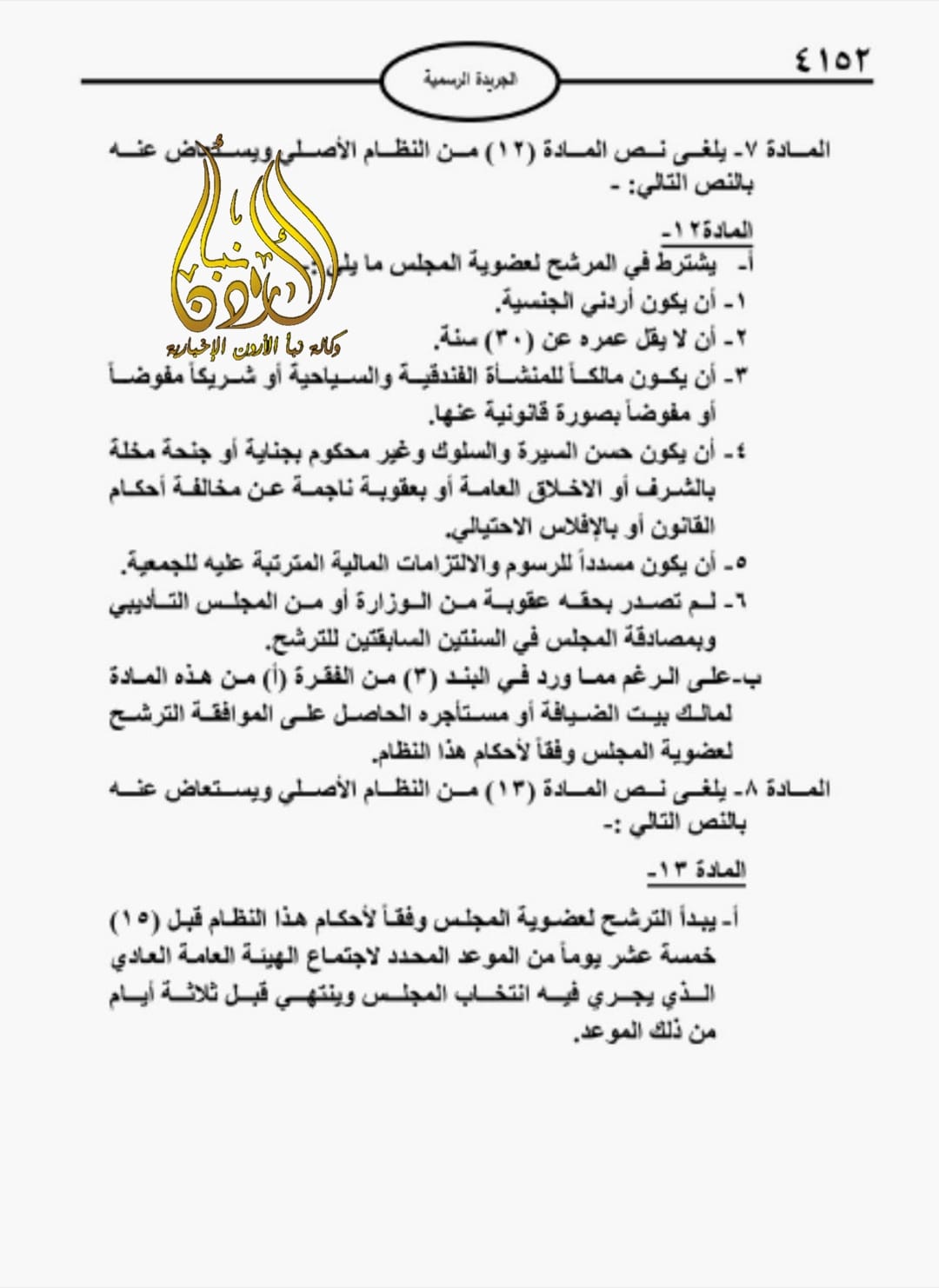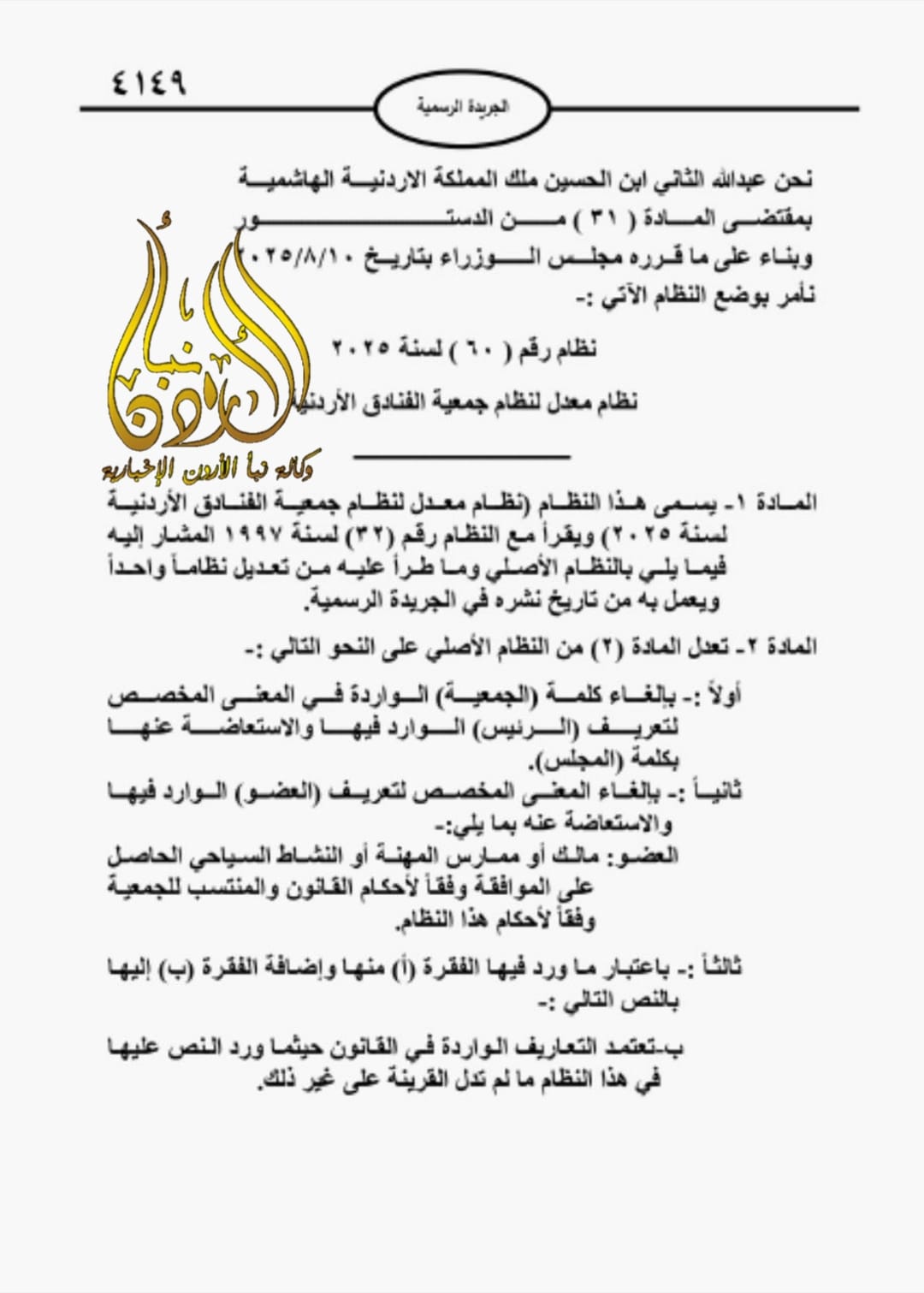 صدرت الإرادة الملكية السامية بالموافقة على النظام المعدل لنظام جمعية الفنادق الأردنية.