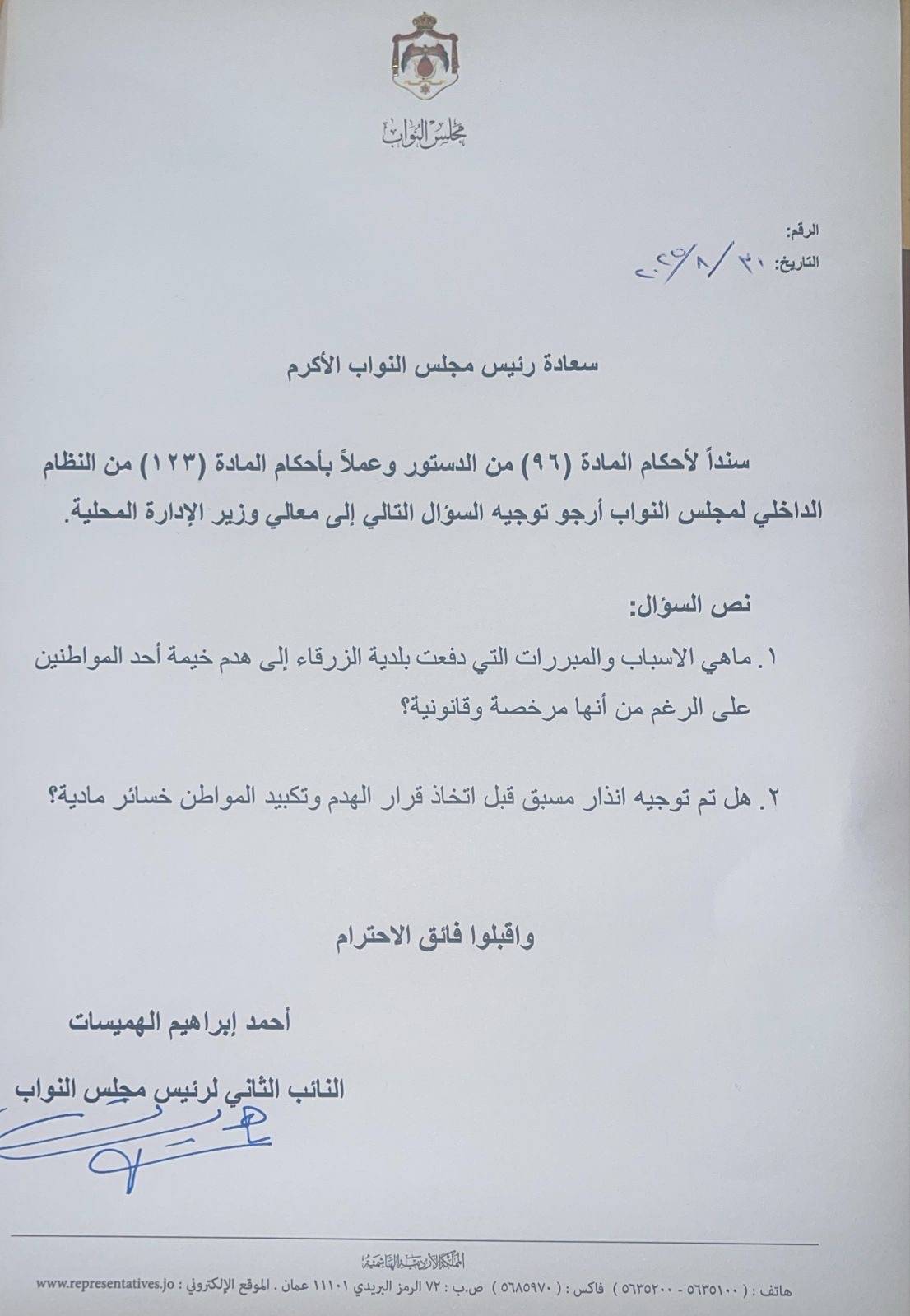 وجّه النائب أحمد إبراهيم الهميسات، النائب الثاني لرئيس مجلس النواب، سؤالاً نيابياً إلى معالي وزير الإدارة المحلية، استناداً لأحكام المادة (96) من الدستور، وعملاً بالمادة (123) من النظام الداخلي لمجلس النواب، حول الإجراءات التي اتخذتها بلدية الزرقاء بحق أحد المواطنين.
