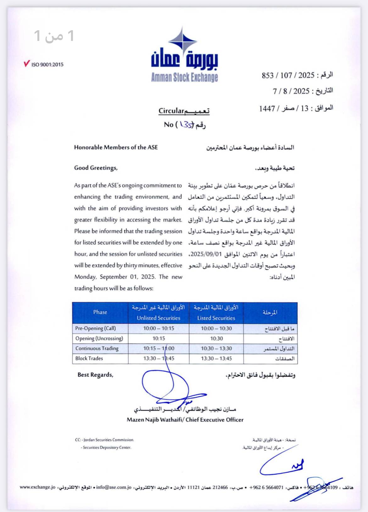 أعلنت بورصة عمّان عن تمديد جلسة التداول للأوراق المالية المدرجة بواقع ساعة إضافية، فيما سيتم تمديد جلسة الأوراق المالية غير المدرجة لمدة نصف ساعة، وذلك ابتداءً من يوم الاثنين الموافق 1 أيلول 2025.