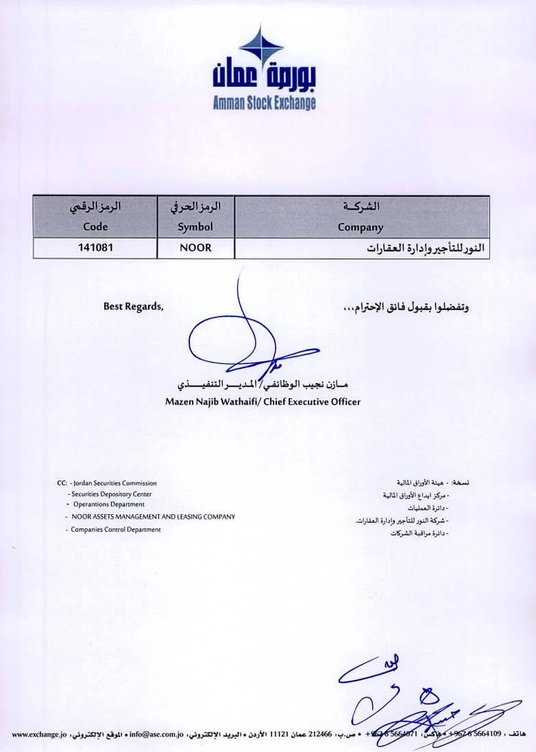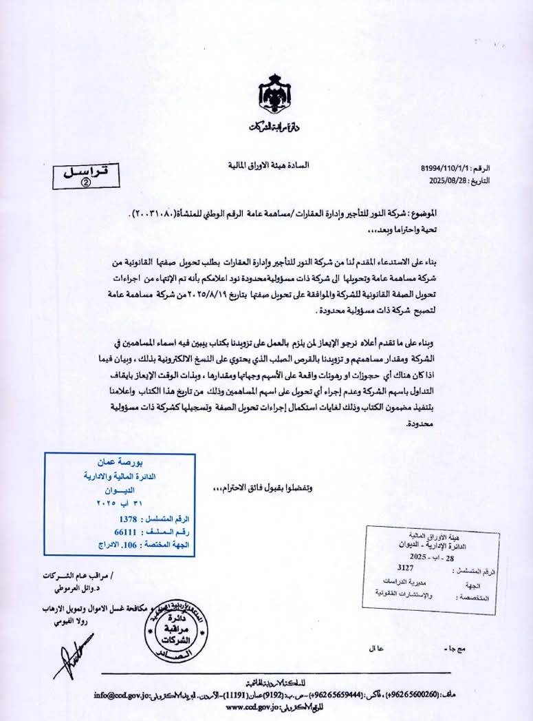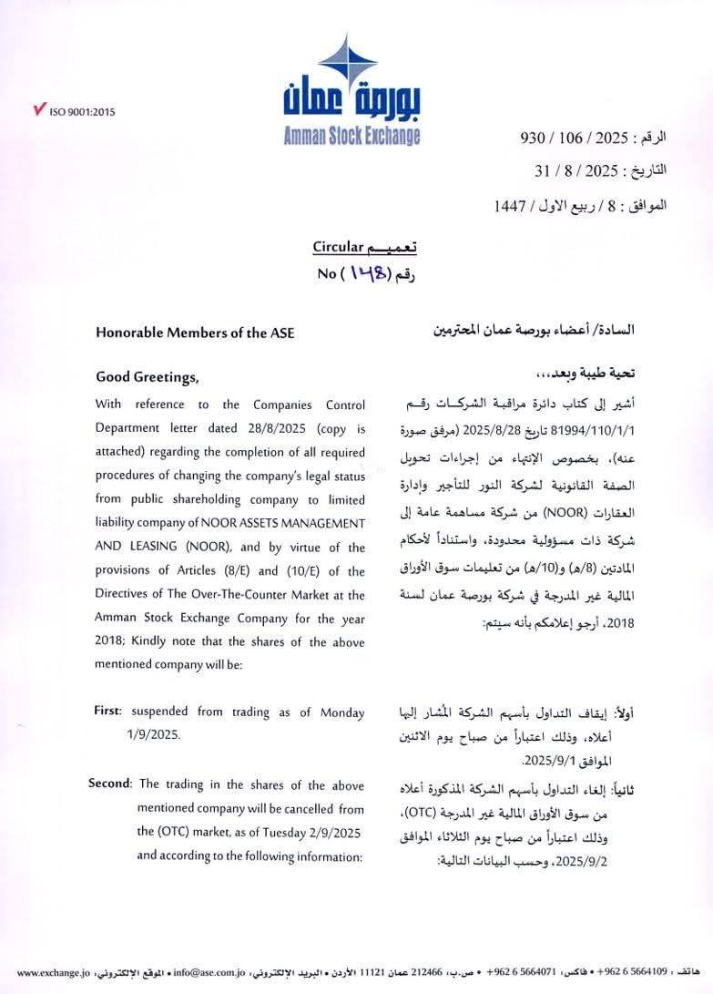 أعلنت بورصة عمان عن إيقاف تداول أسهم شركة النور للتأجير وإدارة العقارات (NOOR) اعتبارًا من صباح يوم الإثنين 1/9/2025، تمهيدًا لإلغاء إدراجها من سوق الأوراق المالية غير المدرجة (OTC) اعتبارًا من يوم الثلاثاء 2/9/2025.