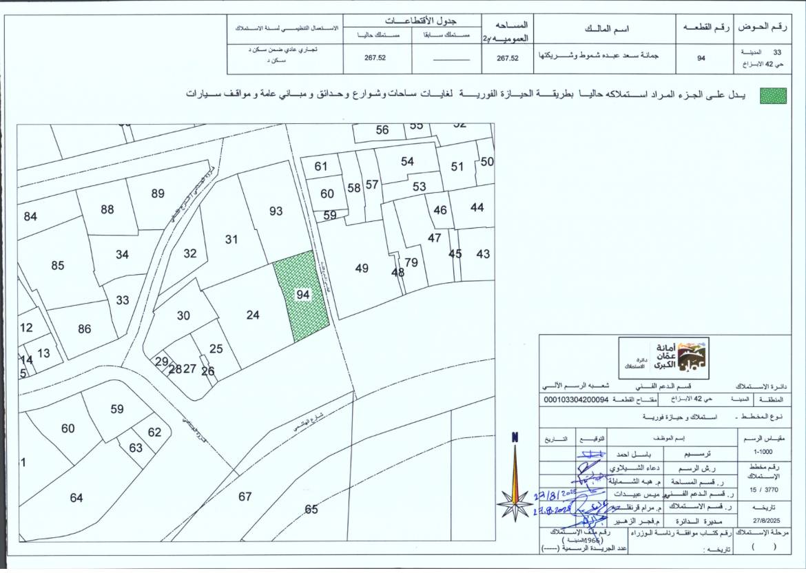 أعلنت أمانة عمان عن استملاك أراضٍ لغايات إنشاء ساحات وشوارع وحدائق ومبانٍ عامة ومواقف سيارات، استناداً لأحكام المواد (179، 181، 182، 183، 204) من قانون الملكية العقارية رقم (13) لسنة 2019، حيث تعتزم التقدم بعد خمسة عشر يوماً من تاريخ نشر هذا الإعلان في صحيفتين محليتين بطلب إلى مجلس الوزراء لاستصدار قرار باستملاك كامل مساحة قطعة الأرض رقم (94) حوض (33) المدينة حي (42) الأبزاخ، والبالغة مساحتها (267.52 م²)، والعائدة ملكيتها للسيدة جمانة سعد عيده شموط وشريكتها.”