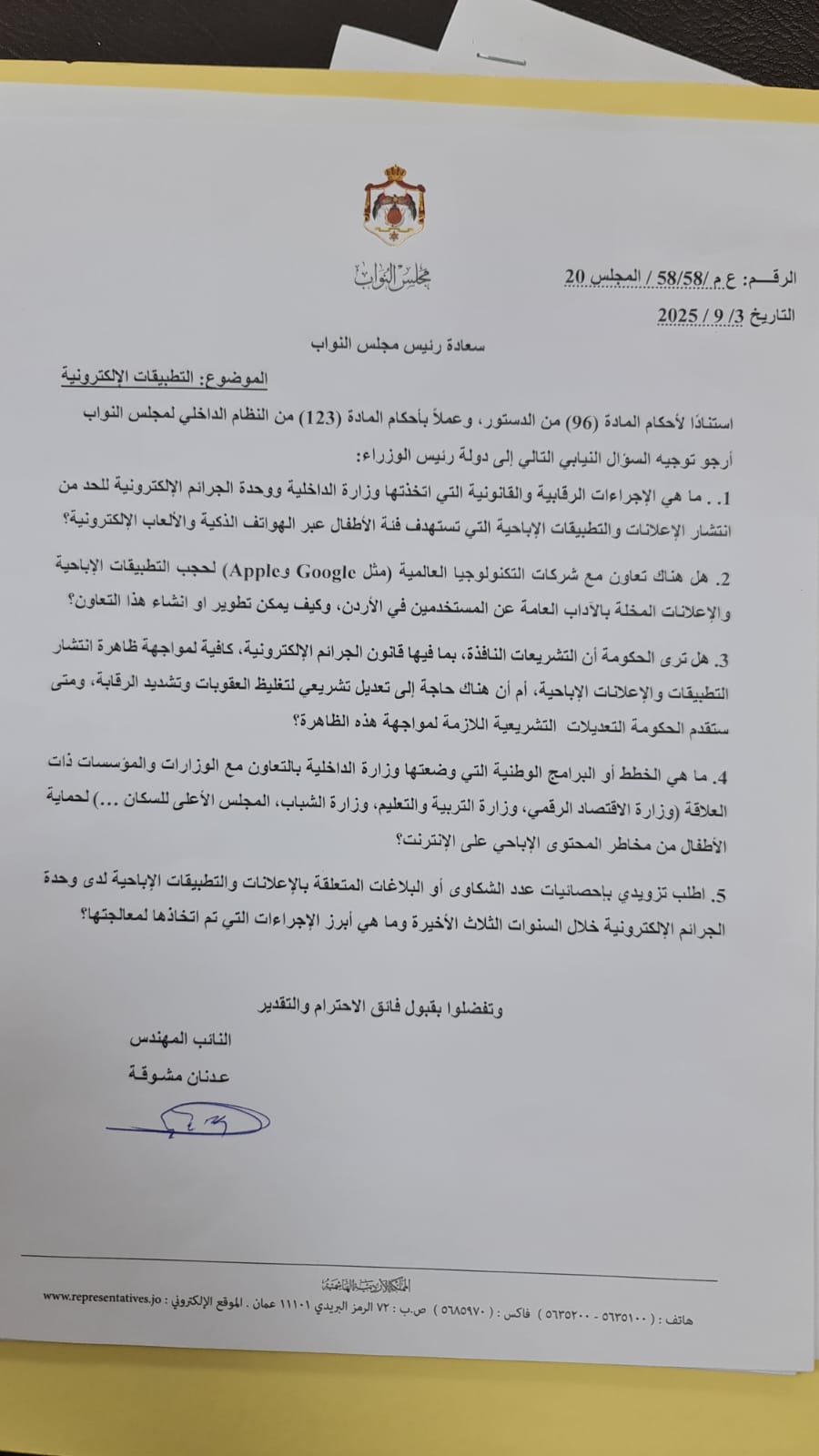 3. هل ترى الحكومة أن التشريعات النافذة، وفيها نصوص تجرم الجرائم الإلكترونية، كافية لمواجهة ظاهرة التطبيقات والإعلانات الإباحية، أم أن هناك حاجة إلى تعديل تشريعي لتغليظ العقوبات وتشديد الرقابة، ومتى ستقدم الحكومة التعديلات التشريعية اللازمة لمواجهة هذه الظاهرة؟