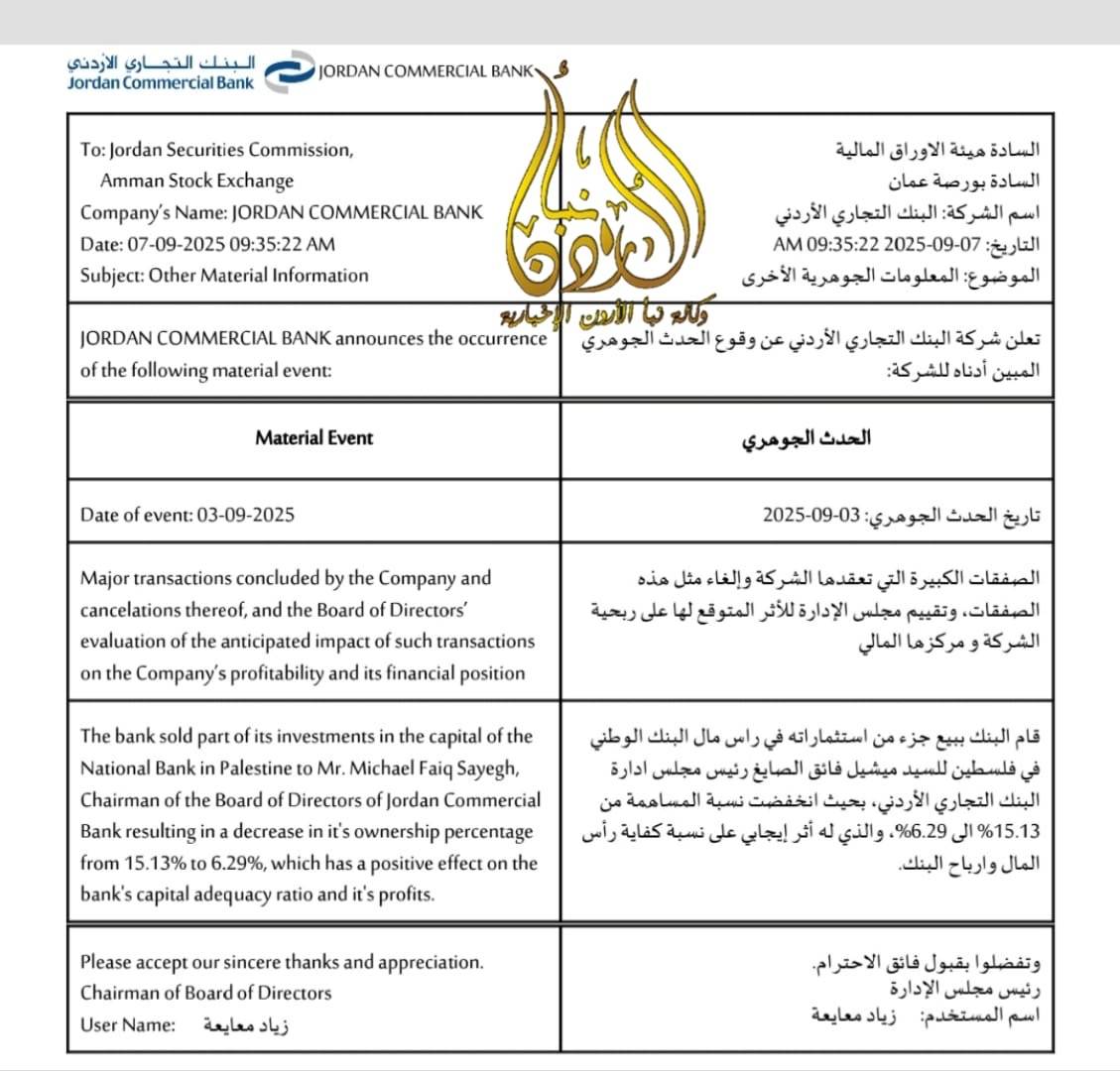 وقال البنك في إفصاحه إنه تم بيع جزء من استثمارات البنك في رأسمال البنك الوطني في فلسطين، لميشيل الصايغ، رئيس مجلس إدارة البنك التجاري الأردني.