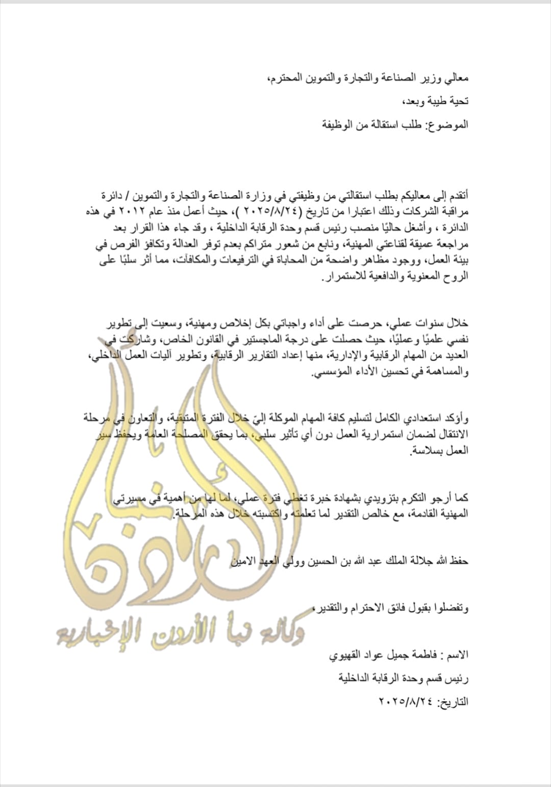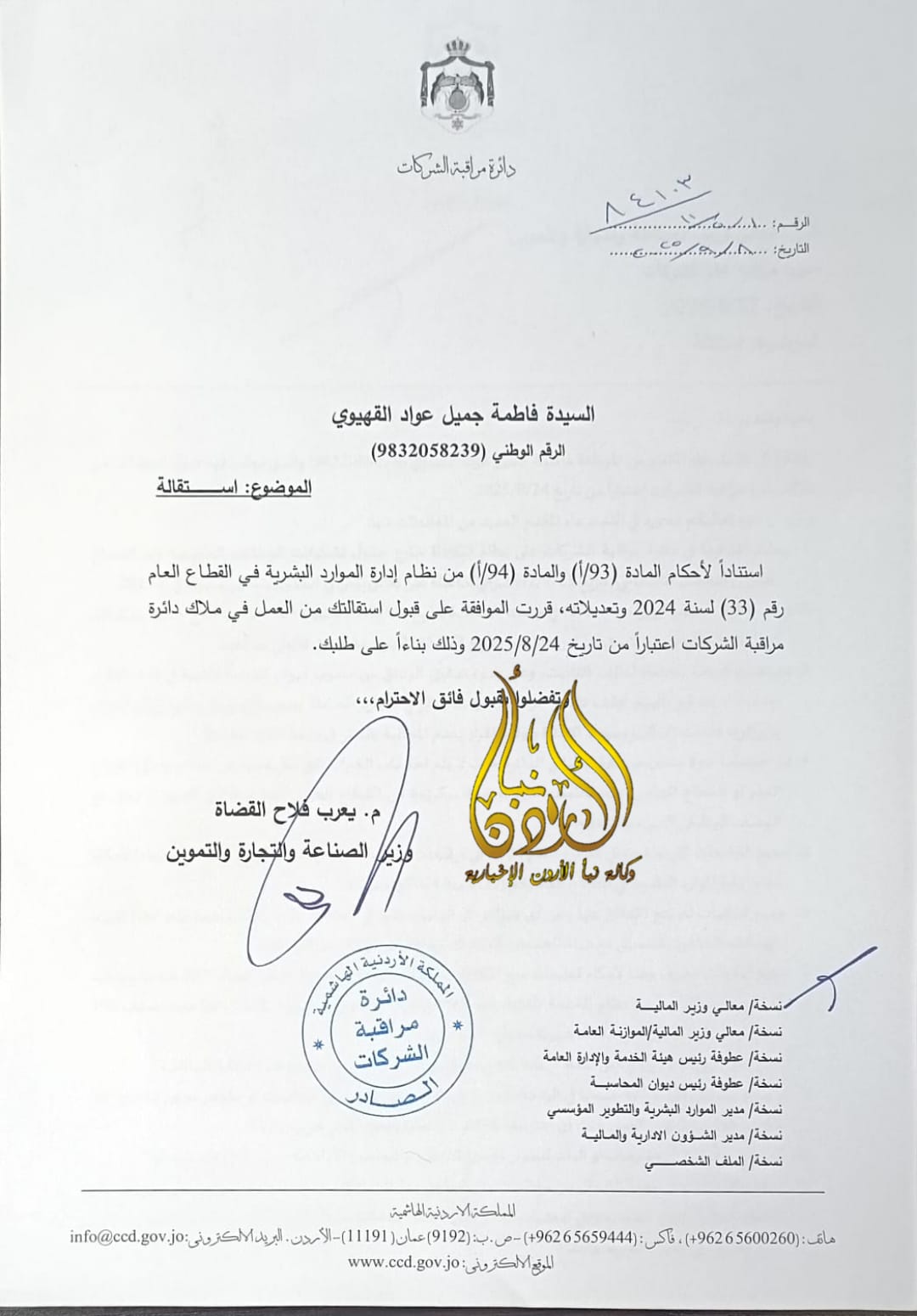 وتالياً نص استقالة القهيوي، وموافقة الوزير :
