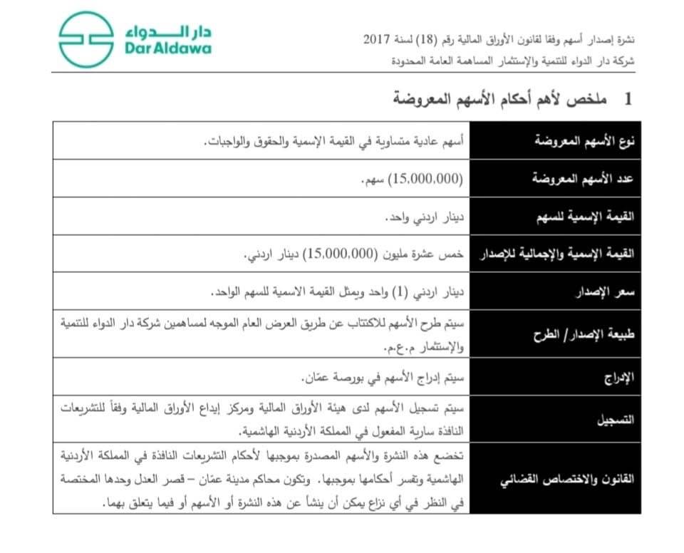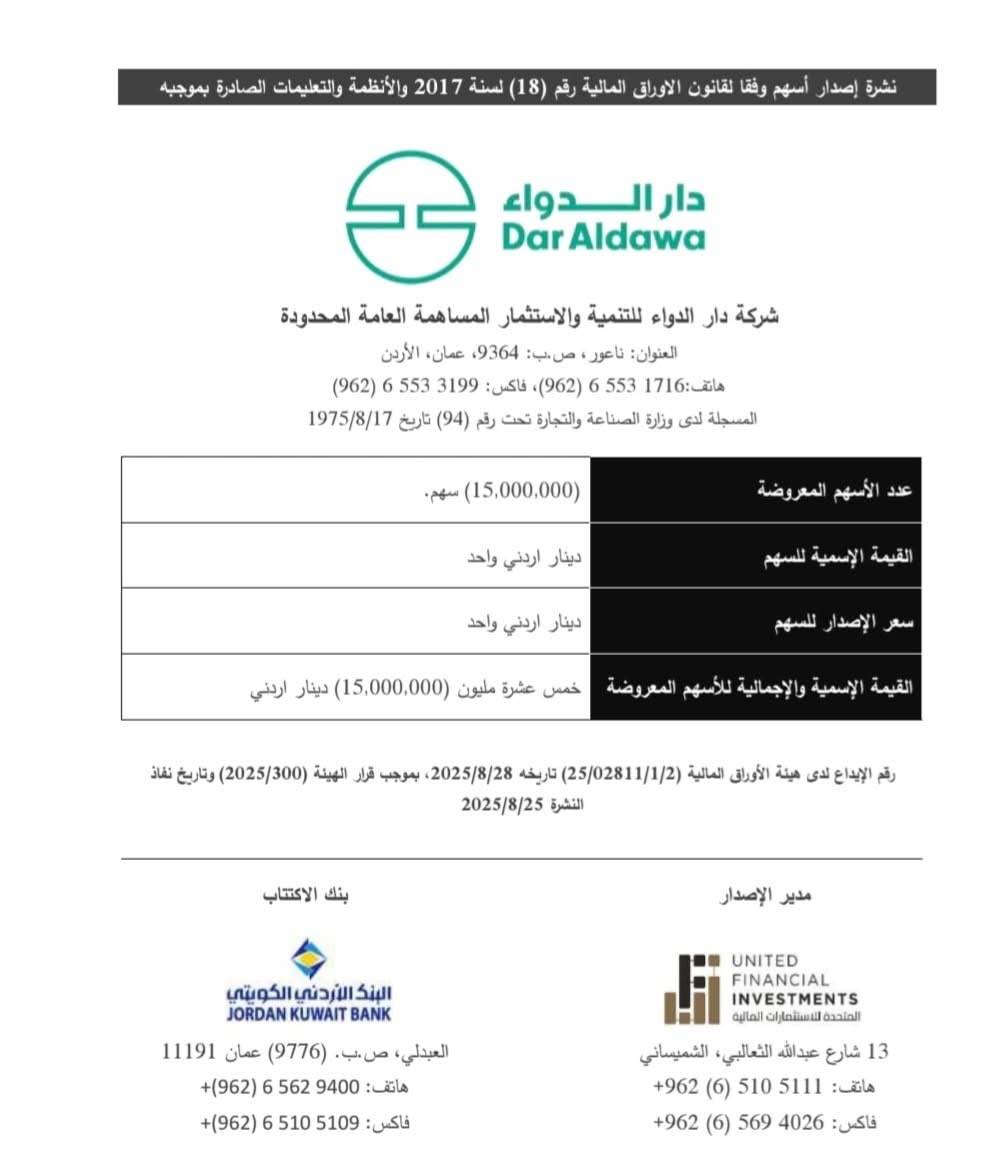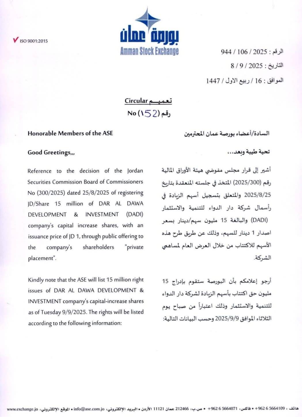 أعلنت بورصة عمان، اليوم الاثنين، عن إدراج 15 مليون سهم حق اكتتاب لزيادة رأسمال شركة دار الدواء للتنمية والاستثمار (DADI) بسعر إصدار دينار واحد للسهم، وذلك اعتبارًا من صباح يوم الثلاثاء 9/9/2025.