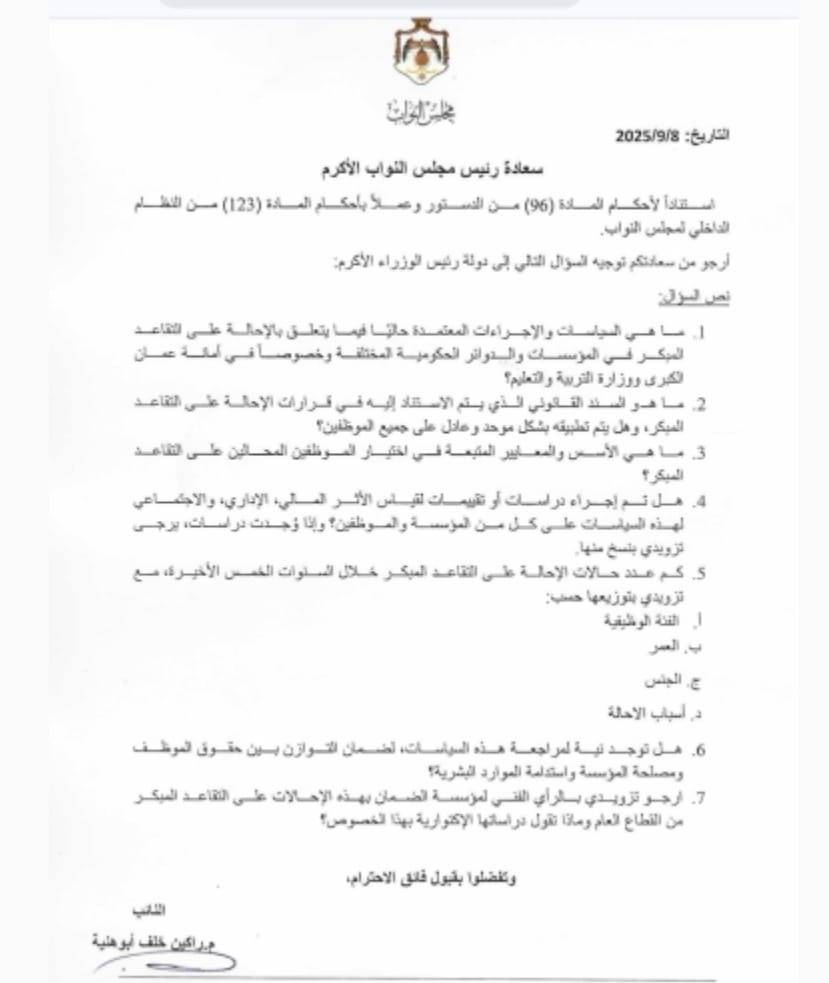 وجهت النائب راكين أبو هنية، عضو كتلة حزب جبهة العمل الإسلامي، سؤالاً نيابياً للحكومة، وصل ل "دقيقة أخبار"نسخة منه، أثارت فيه جملة من القضايا المتعلقة بسياسات الإحالة على التقاعد المبكر في المؤسسات والدوائر الحكومية، مع تركيز خاص على أمانة عمان الكبرى ووزارة التربية والتعليم.