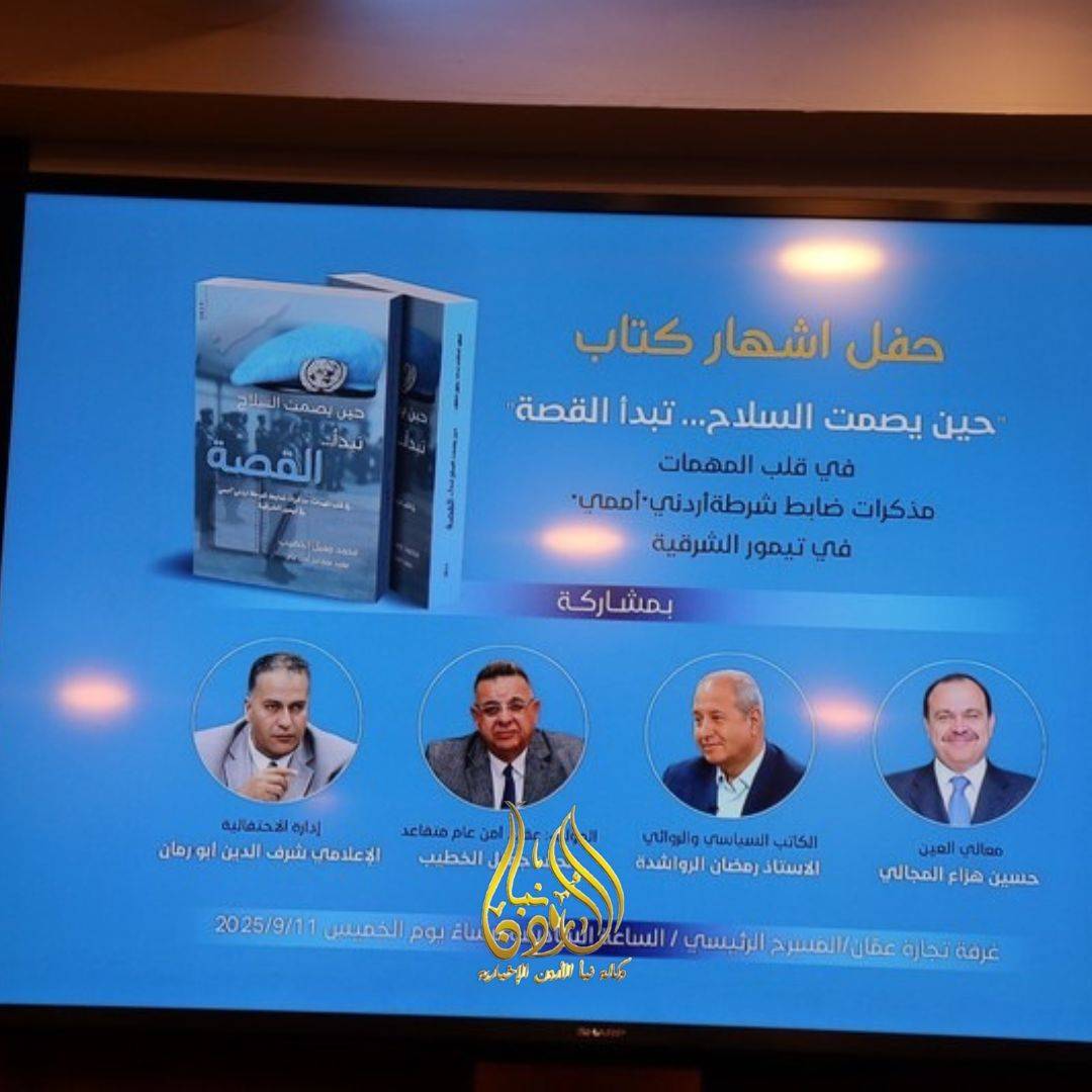 شهدت غرفة تجارة عمان مساء اليوم الخميس حفل اشهار كتاب "حين يصمت السلاح... تبدأ القصة – في قلب المهمات: مذكرات ضابط شرطة أردني أممي في تيمور الشرقية"، لمؤلفه العقيد المتقاعد محمد جميل الخطيب، بحضور حشد من الشخصيات الامنية والوطنية والثقافية والاعلامية.