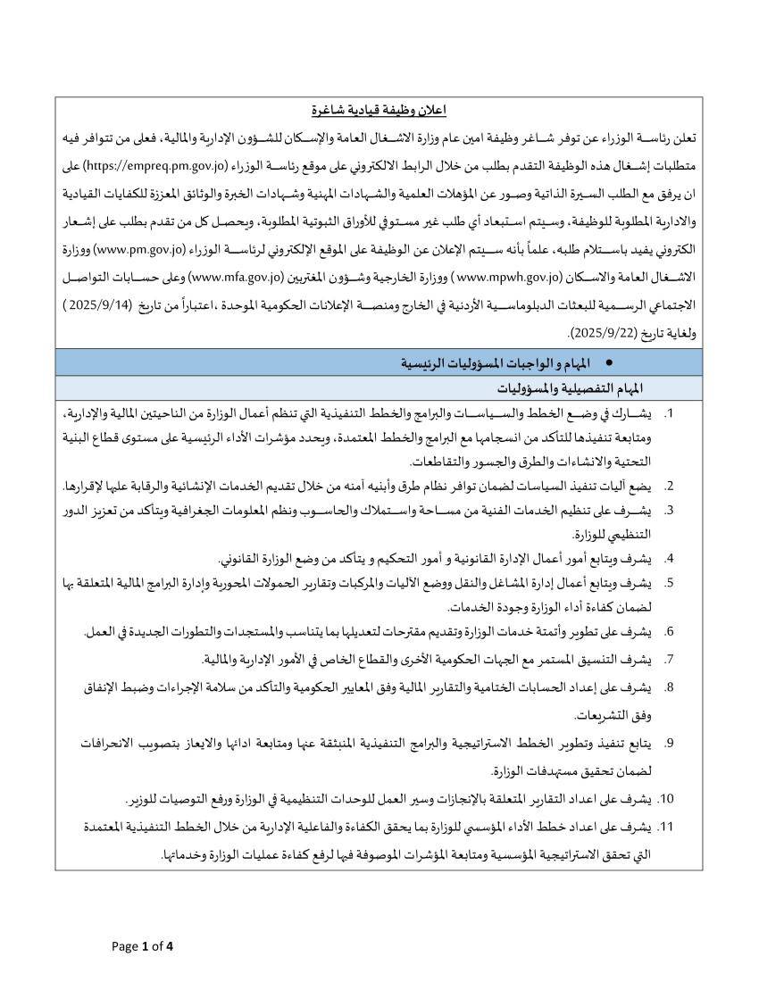أعلنت رئاسة الوزراء عن فتح باب التقديم لشغل منصب "أمين عام وزارة الأشغال العامة والإسكان للشؤون الإدارية والمالية". وتستمر فترة التقديم من يوم الأحد الموافق 14 سبتمبر 2025 حتى 28 سبتمبر 2025.