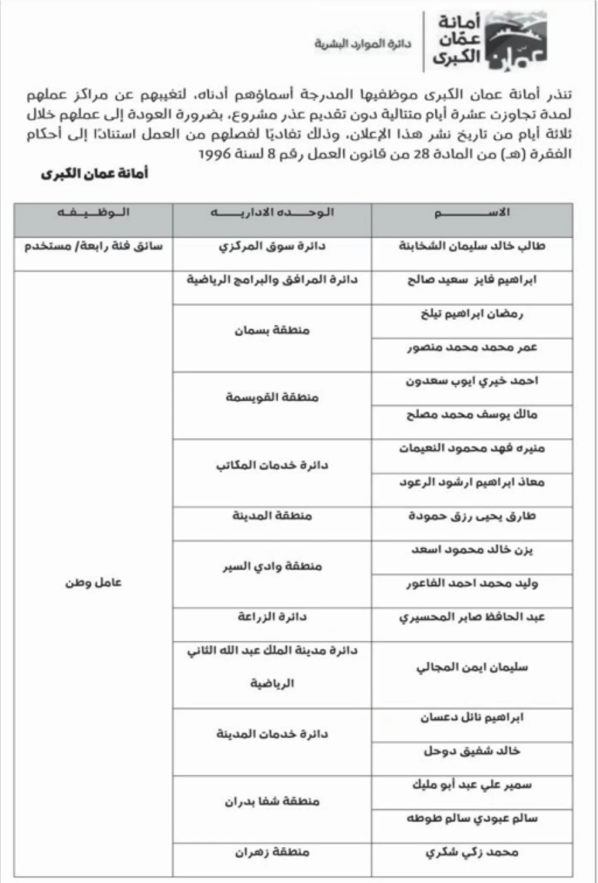 أمانة عمان تنذر موظفين بالفصل - أسماء