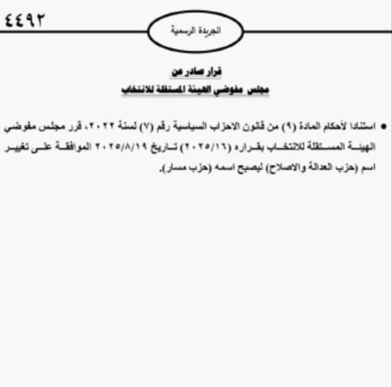 قرر مجلس مفوضي الهيئة المستقلة للانتخاب الموافقة على تغيير اسم حزب "العدالة والإصلاح" ليصبح اسمه حزب "مسار"، وفقا للجريدة الرسمية في عددها المنشور الثلاثاء.