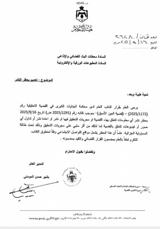 وأكدت الهيئة في كتابها الصادر اليوم الثلاثاء الموافق 16 أيلول 2025، أنه يحظر نشر أو إعادة نشر أو تداول أي معلومات أو صور أو فيديوهات تتعلق بالقضية أو مجريات التحقيق فيها، لما لذلك من أثر سلبي على سير التحقيق، مشددة على أن المخالفين سيتحملون المسؤولية الجزائية.