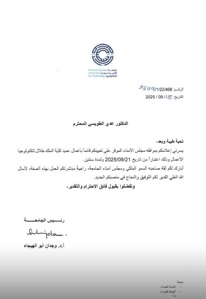 نجل الوزير الأسبق الطويسي عميداً لكلية الملك طلال لتكنولوجيا الأعمال في جامعة الأميرة سمية للتكنولوجيا