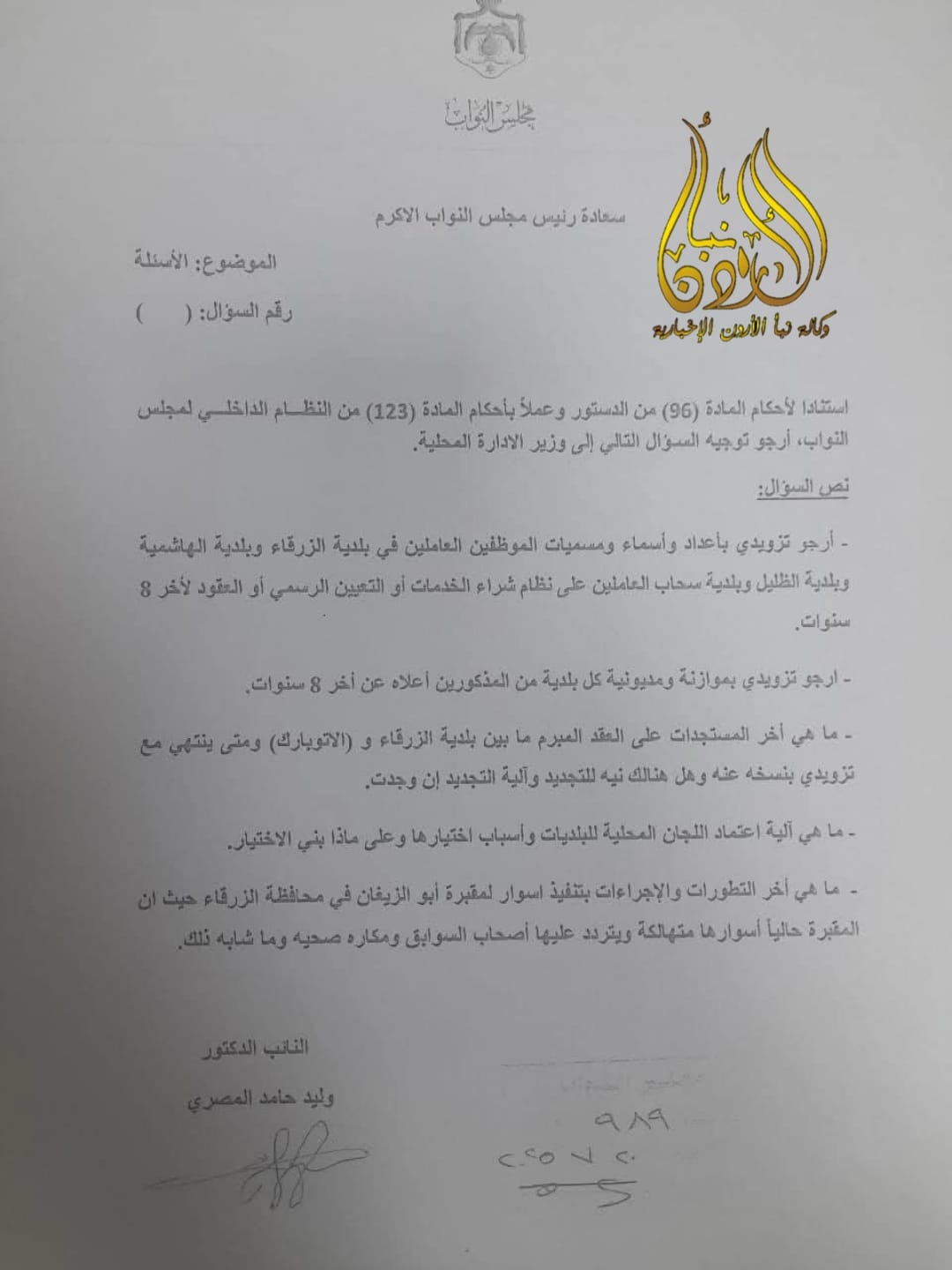وجه النائب وليد المصري سؤالاً إلى وزير الإدارة المحلية، وليد المصري، حول الكثير من قضايا الزرقاء.