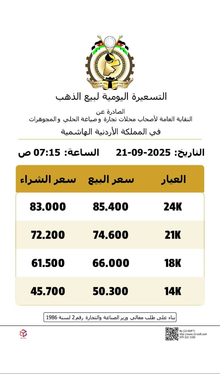 وبحسب النشرة اليومية الصادرة عن النقابة العامة لأصحاب محلات تجارة وصياغة الحلي والمجوهرات، بلغ سعر غرام الذهب عيار 24 نحو 85.4 ديناراً، فيما وصل سعر غرام عيار 18 إلى 66 ديناراً، وعيار 14 إلى 50.30 ديناراً.