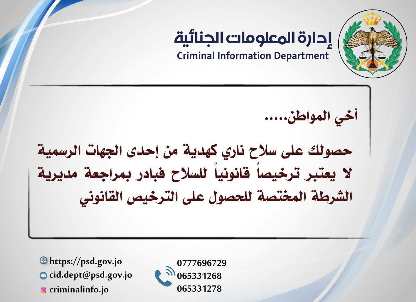 نوهت إدارة المعلومات الجنائية في مديرية الامن العام، المواطنين، إلى ضرورة ترخيص أي سلاح حصلوا عليه من أي جهة رسمية.