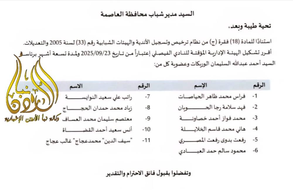 قرر وزير الشباب رائد العدوان تشكيل الهيئة الادارية المؤقتة للنادي الفيصلي اعتبارا من تاريخ 23/9/2025 ولمدة تسعة اشهر برئاسة السيد احمد عبدالله السليمان الوريكات وعضوية كل من: