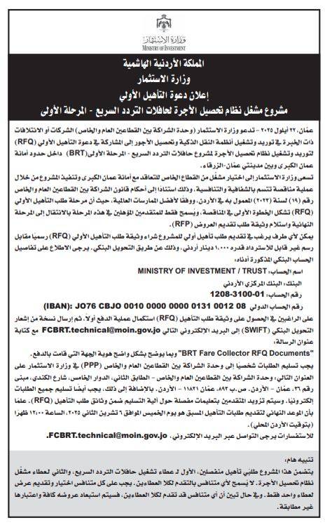 تدعو وزارة الاستثمار الشركات المحلية والدولية المؤهلة للتقديم على مرحلة التأهيل الأولي.