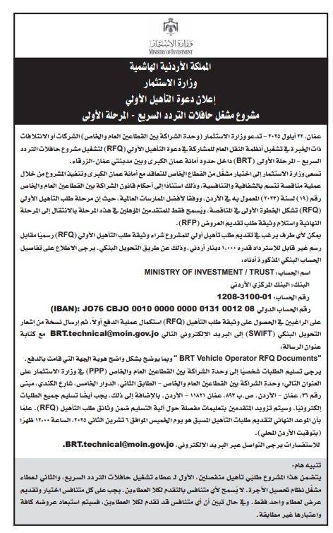 أعلنت وزارة الاستثمار من خلال وحدة الشراكة بين القطاعين العام والخاص عن إطلاق دعوة تأهيل أولي لمشروع حافلات التردد السريع (BRT) المرحلة الأولى.