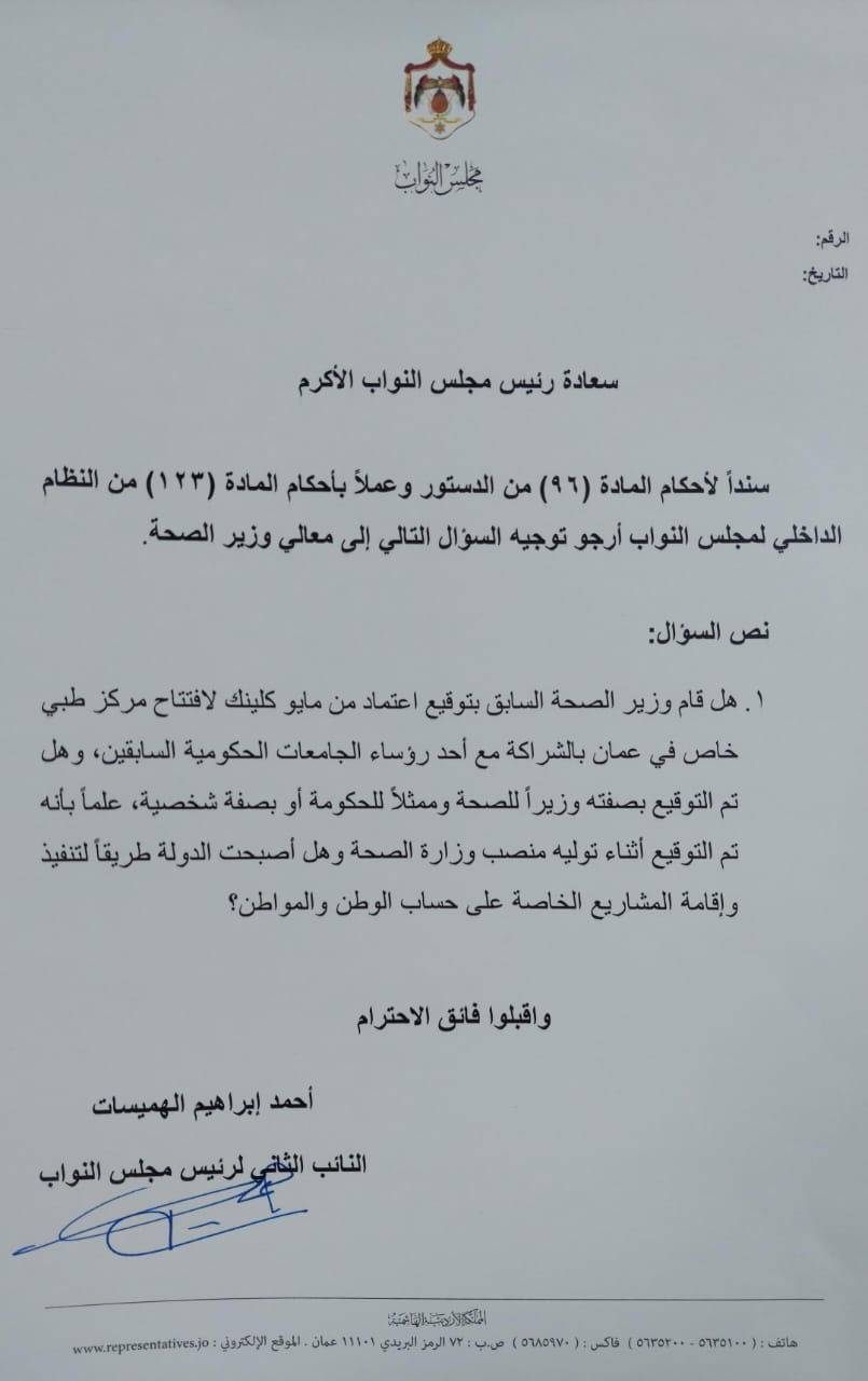 وطلب الهميسات في كتاب رسمي رفعه إلى رئاسة المجلس، توضيحات من وزير الصحة الحالي حول ما إذا كان الوزير السابق قد وقّع اعتمادًا من "مايو كلينك" لافتتاح مركز طبي خاص في عمان، بالشراكة مع أحد رؤساء الجامعات الحكومية السابقين.