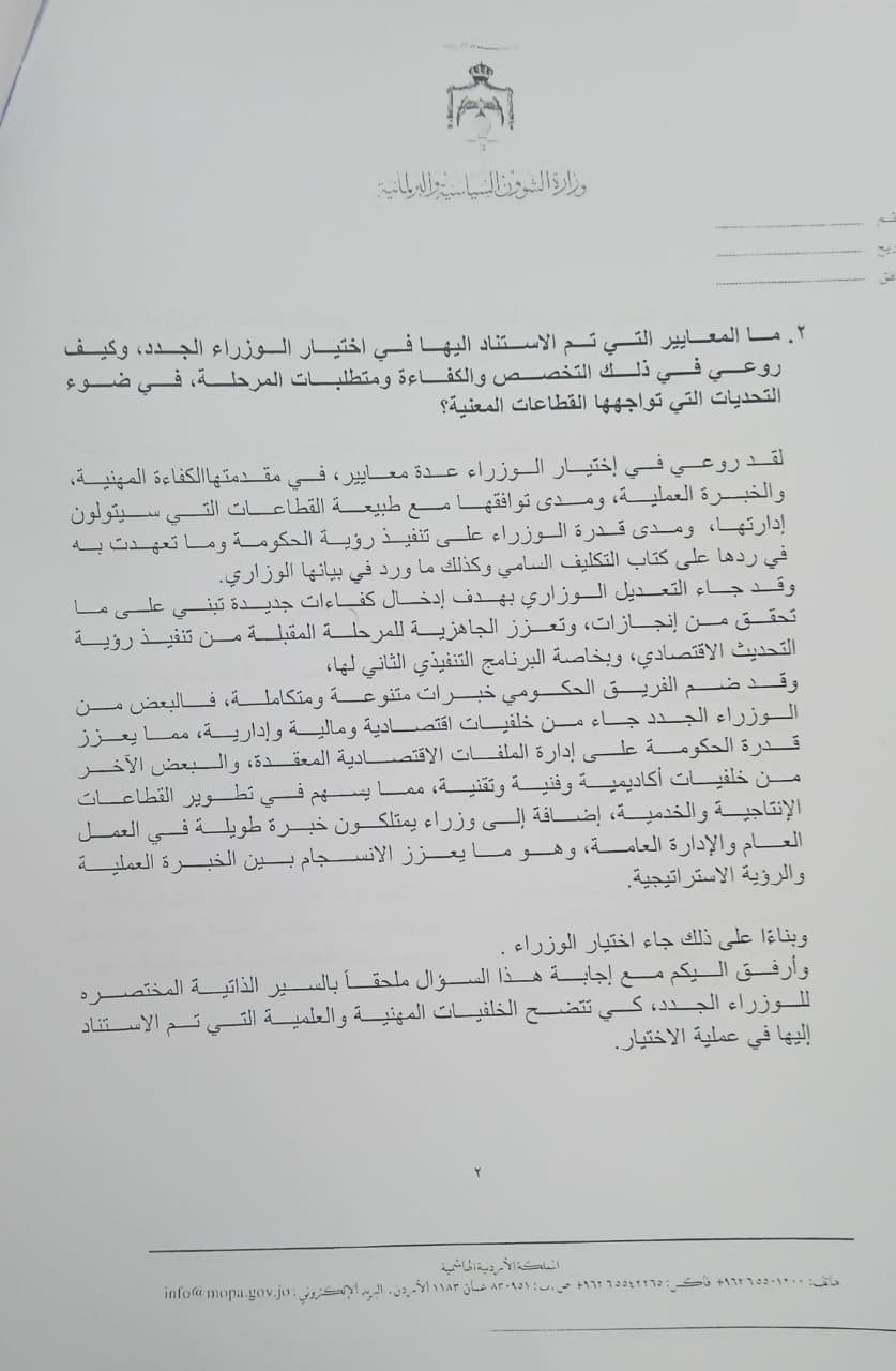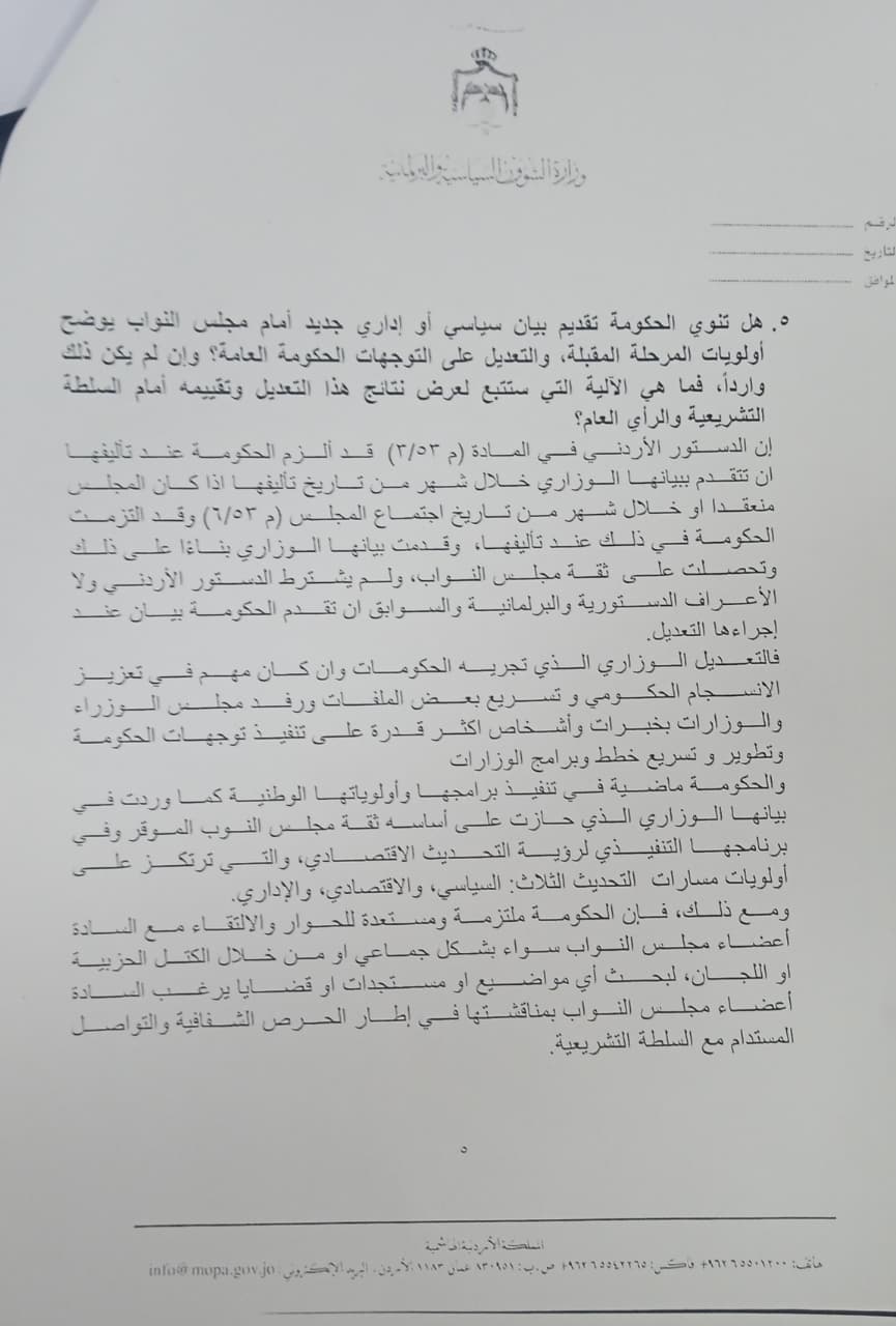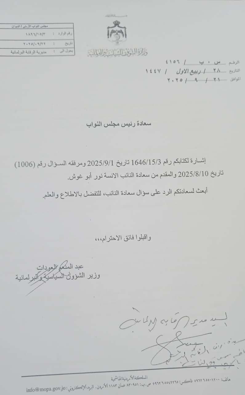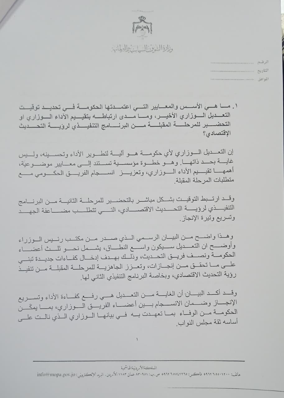 احمد قدورة - قدّمت الحكومة ردّاً مفصلاً على سؤال النائبة نور أبو غوش المتعلق بأسس ومعايير التعديل الوزاري الأخير، وآلية اختيار الوزراء وتوقيت التعديل، مؤكدة أنّ الهدف من أي تعديل هو تطوير الأداء الحكومي وتعزيز القدرة على الإنجاز، وليس مجرد تغيير أسماء.