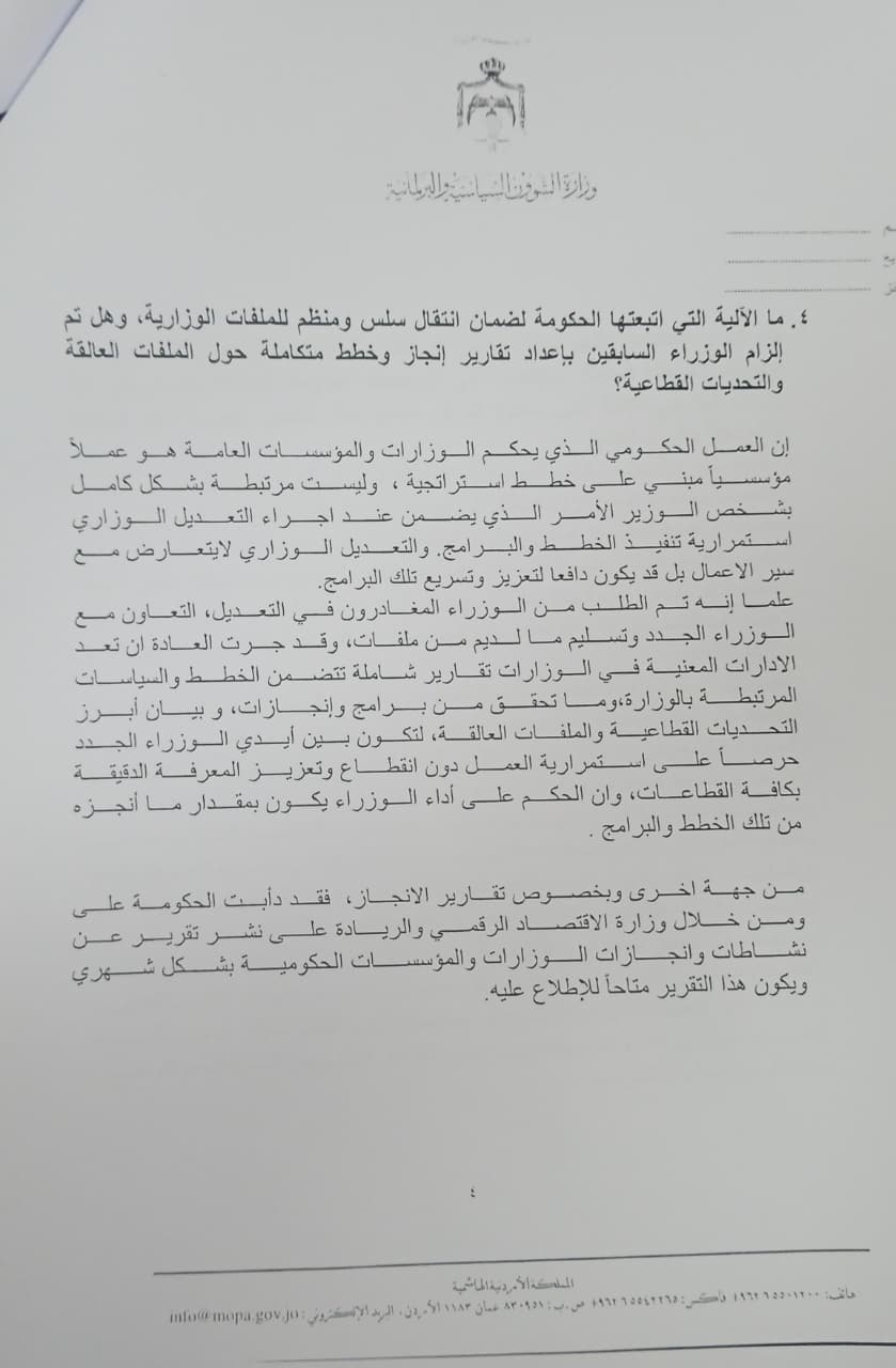 وفي ما يخص انتقال الملفات بين الوزراء، أكدت الحكومة أنها اعتمدت آلية مؤسسية لضمان تسليم سلس ومنظم، من خلال إلزام الوزراء السابقين بإعداد تقارير إنجاز وخطط متكاملة حول الملفات العالقة، مع استمرار نشر تقارير شهرية عبر وزارة الاقتصاد الرقمي والريادة لإطلاع الرأي العام على مستوى التقدم في تنفيذ البرامج.