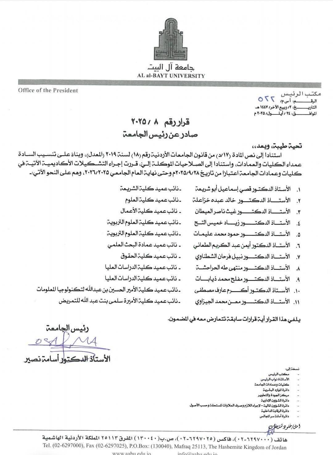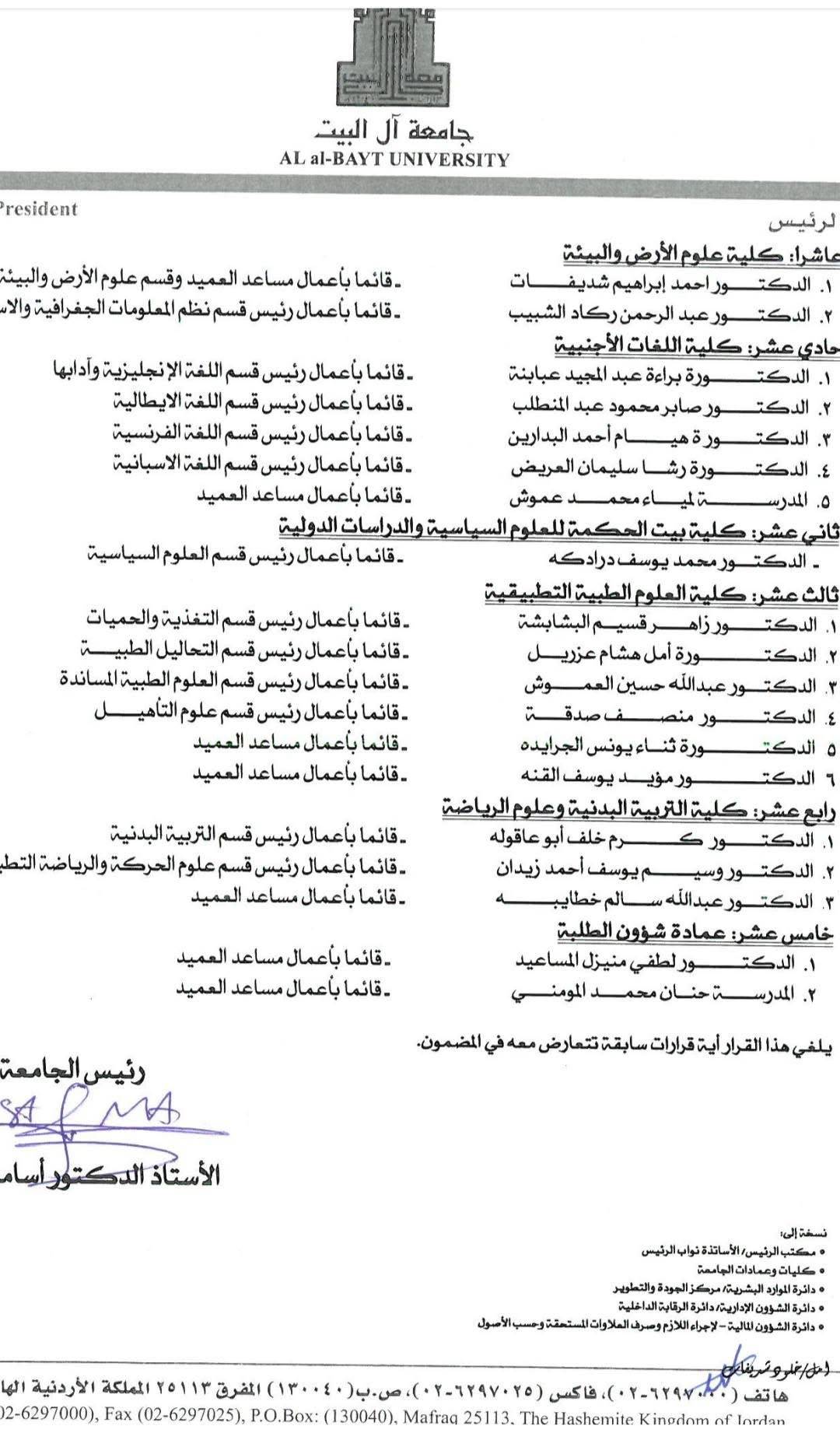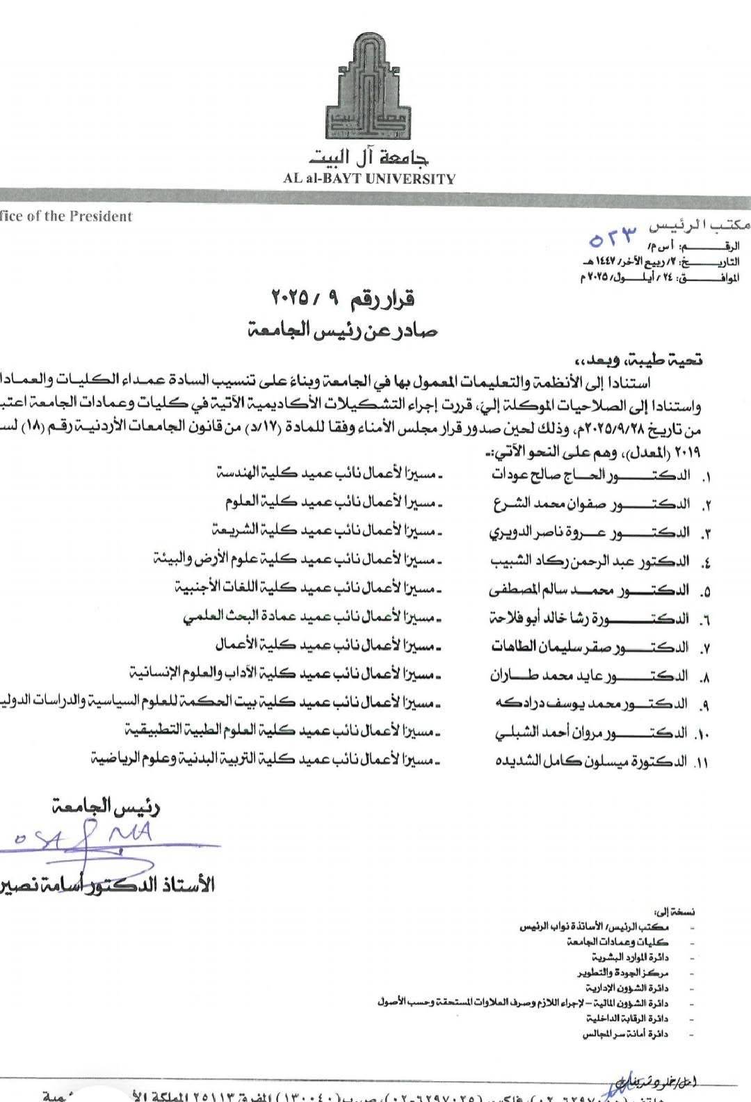 أصدر رئيس جامعة آل البيت، الأستاذ الدكتور أسامة نصير، قرارًا بإجراء تشكيلات أكاديمية وإدارية جديدة، وذلك استنادًا إلى تنسيب عمداء الكليات والأنظمة والتعليمات المعمول بها في الجامعة.