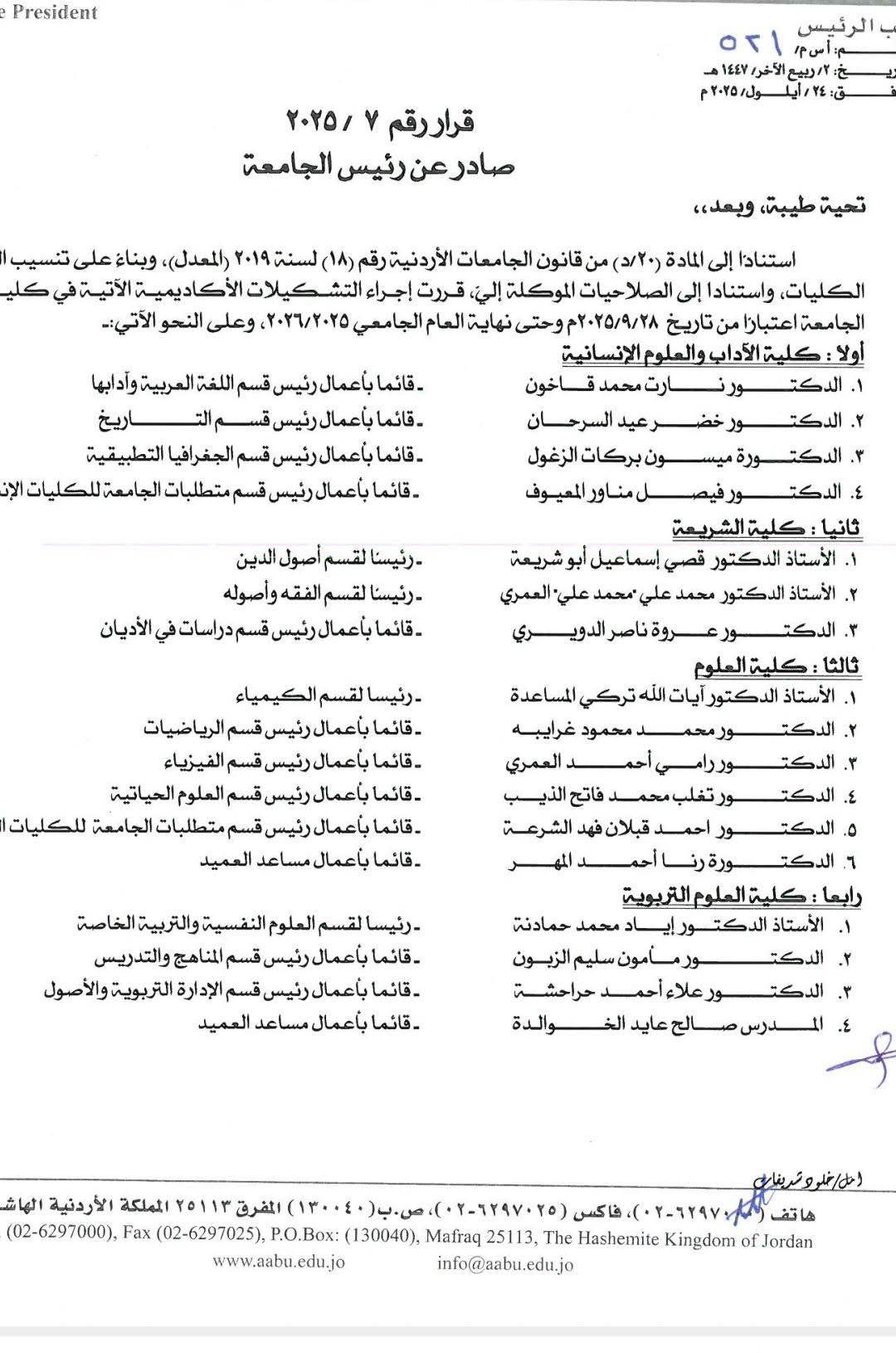 وتشمل التشكيلات عددًا من الكليات والعمادات، اعتبارًا من 28/9/2025، على أن تبقى سارية لحين صدور قرار مجلس الأمناء وفقًا لأحكام المادة (17/د) من قانون الجامعات الأردنية رقم (18).