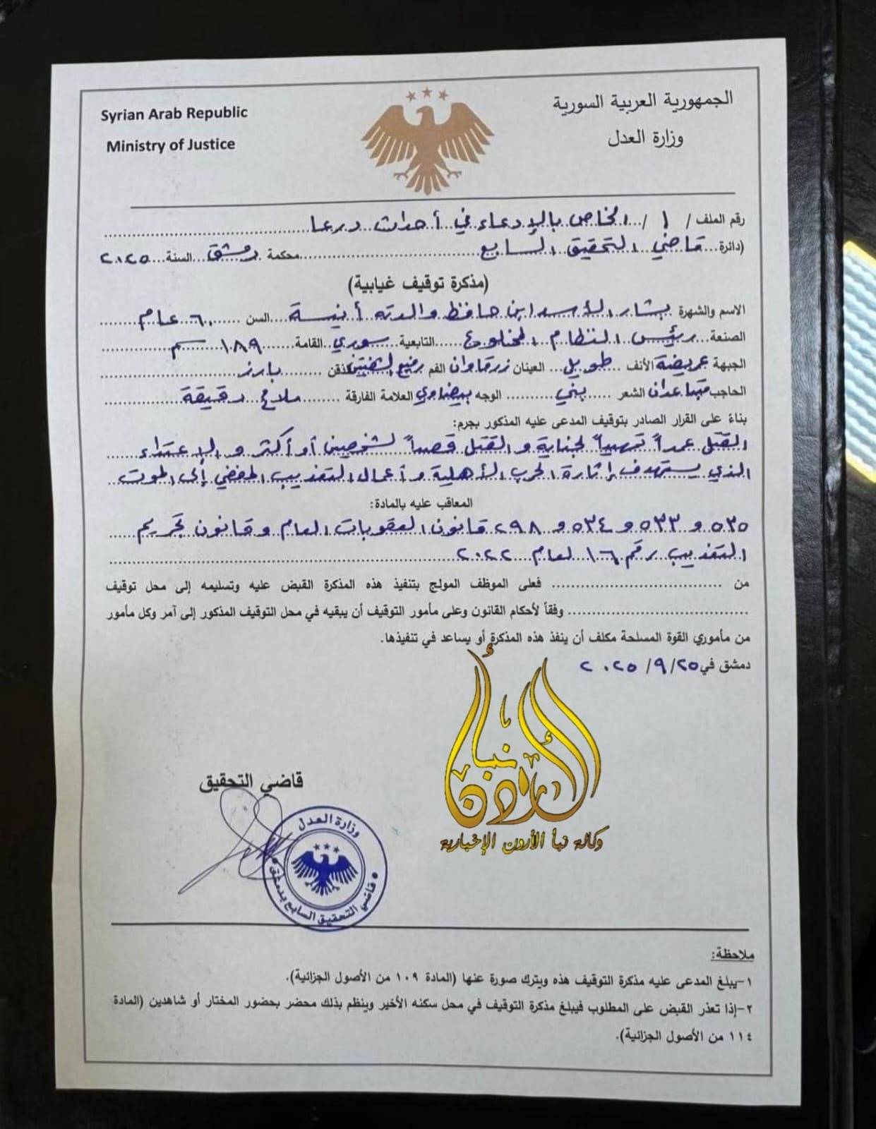 وطلبت المذكرة من الجهات المختصة إلقاء القبض على المتهم وتسليمه إلى محل التوقيف المختص، استناداً إلى القرار الصادر بحقه وأحكام القانون النافذة