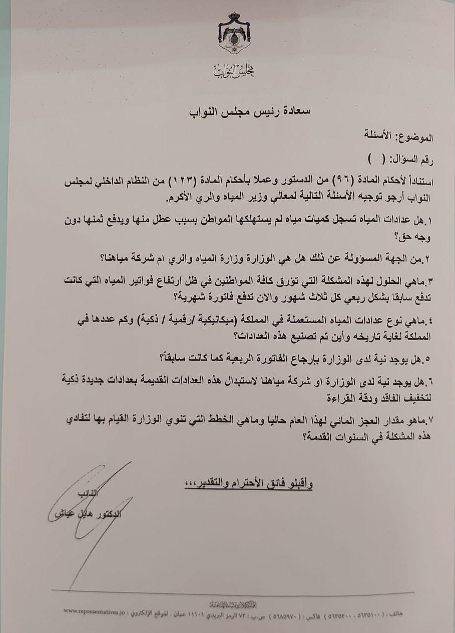 احمد قدورة - وجّه النائب الدكتور هايل عياش سؤالاً نيابياً لوزير المياه والري، استناداً لأحكام المادة (96) من الدستور وعملاً بالمادة (123) من النظام الداخلي.
