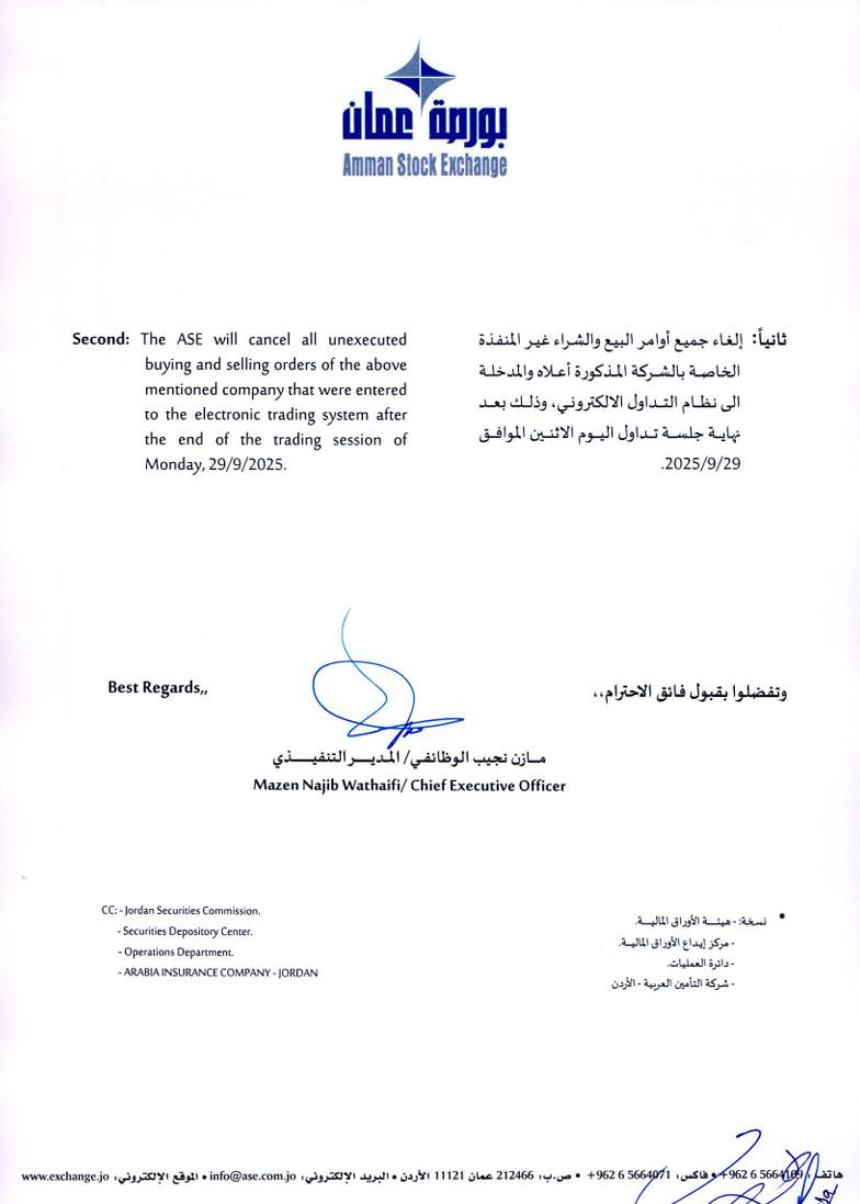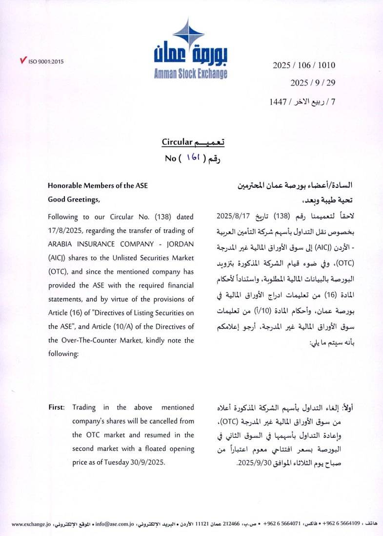 عممت هيئة الاوراق المالية بتاريخ 17/8/2025 بخصوص نقل التداول بأسهم شركة التأمين العربية -الاردن (AICI) الى سوق الاوراق المالية غير المدرجة (OTC), وذلك في ضوء قيام الشركة المذكورة بتزويد البورصة بالبيانات المالية المطلوبة.