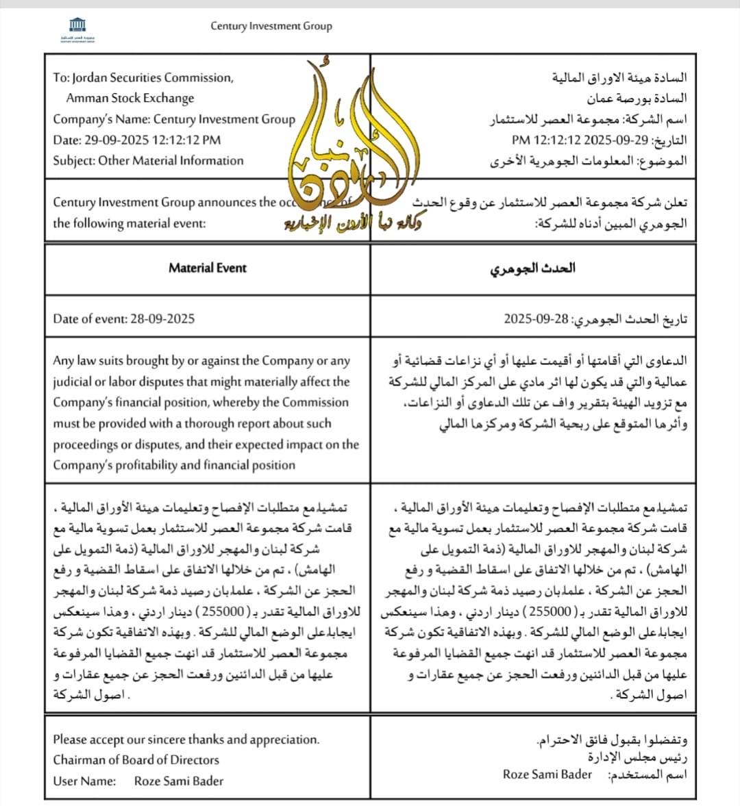 أعلنت شركة مجموعة العصر للاستثمار عن وقوع حدث جوهري بتاريخ 28-09-2025، وذلك استنادًا لمتطلبات الإفصاح وتعليمات هيئة الأوراق المالية.