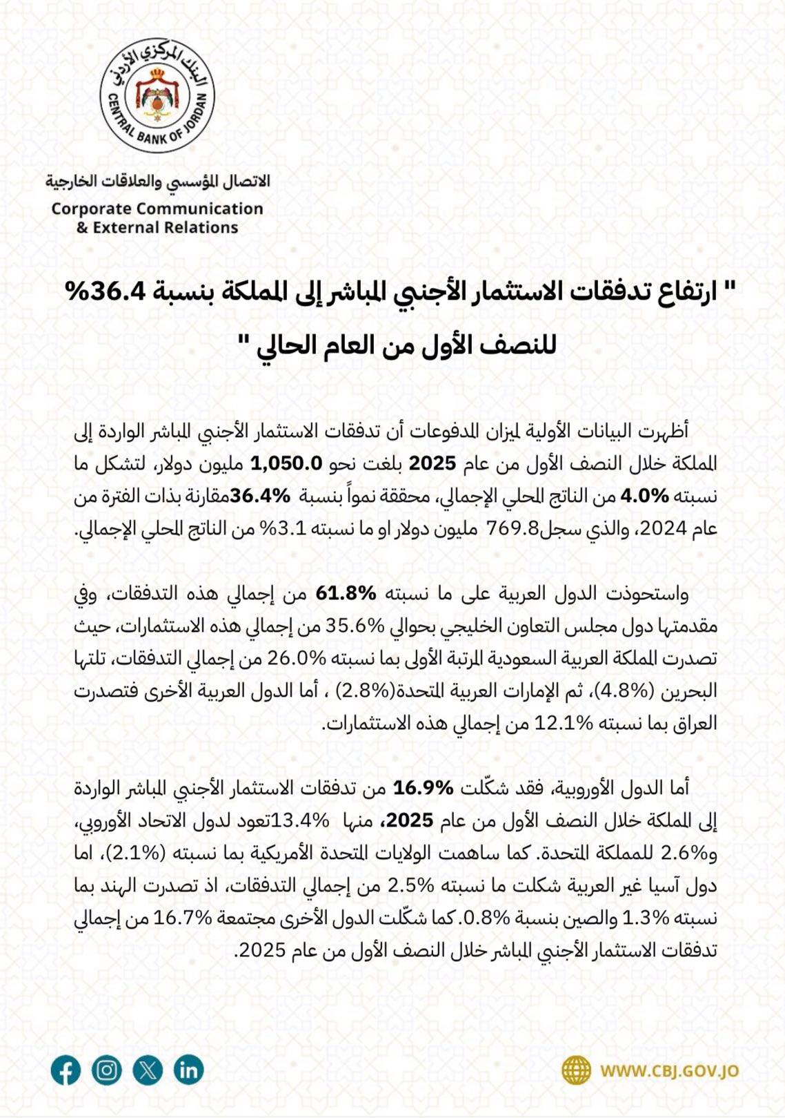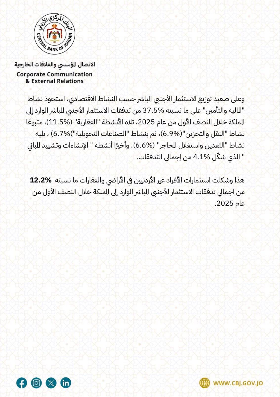 هذا وشكلت استثمارات الأفراد غير الأردنيين في الأراضي والعقارات ما نسبته 12.2% من اجمالي تدفقات الاستثمار الأجنبي المباشر الوارد إلى المملكة خلال النصف الأول من عام 2025.