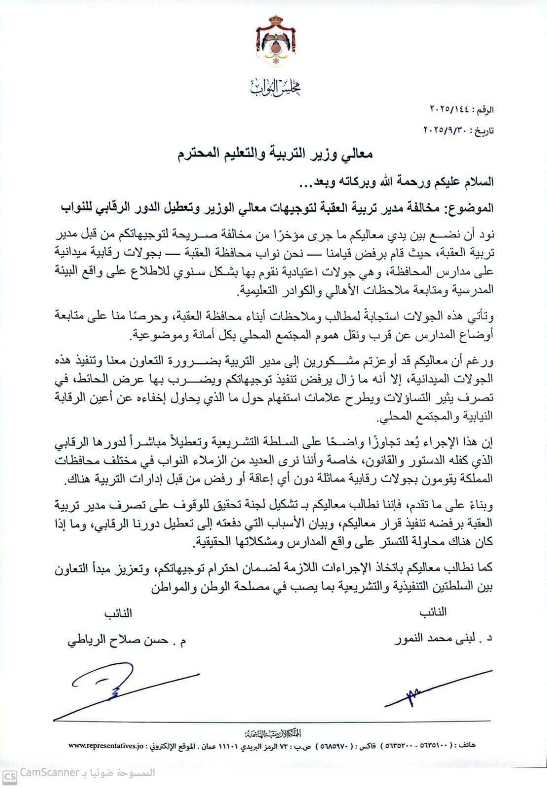 وطالب الرياطي والنمور وزير التربية بتشكيل لجنة تحقيق عاجلة للوقوف على تجاوزات مدير تربية العقبة، وبيان الأسباب التي دفعته لمنع الزيارات النيابية الرقابية، والتأكيد على احترام مبدأ التعاون بين السلطتين التشريعية والتنفيذية بما يصب في مصلحة الوطن والمواطن.