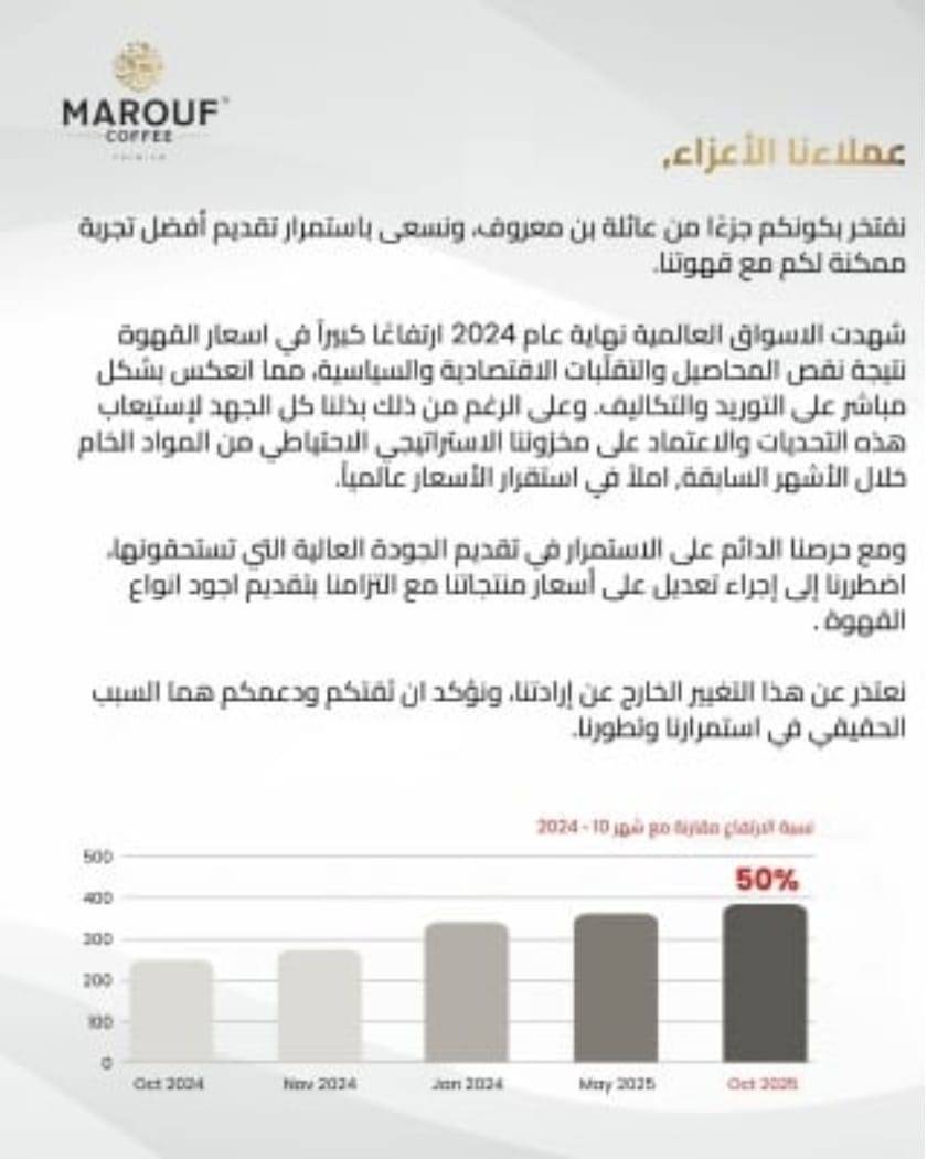 أعلن "بن معروف" عن زيادة أسعار القهوة لديه، مرجعاً القرار إلى ارتفاع الأسعار عالمياً، وتراجع المحاصيل، والتقلبات الاقتصادية والسياسية التي انعكست مباشرة على كلف التوريد.